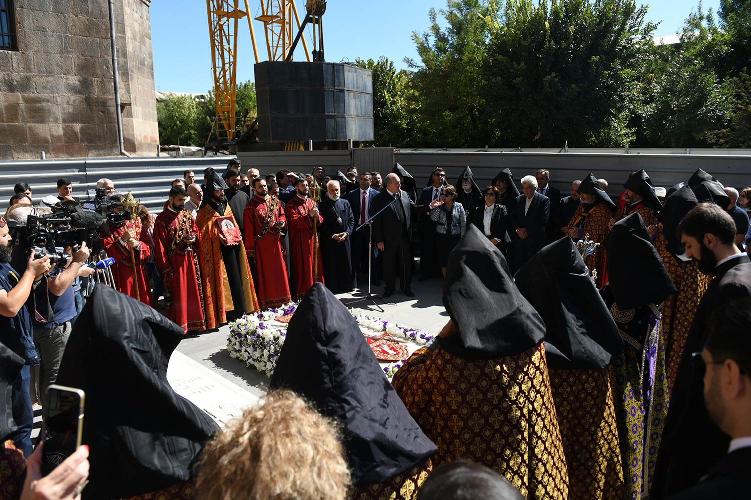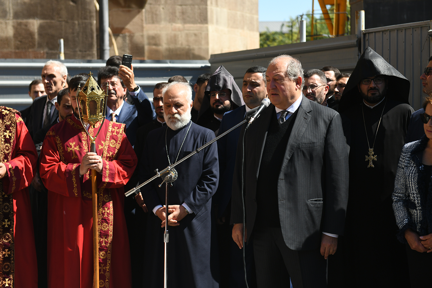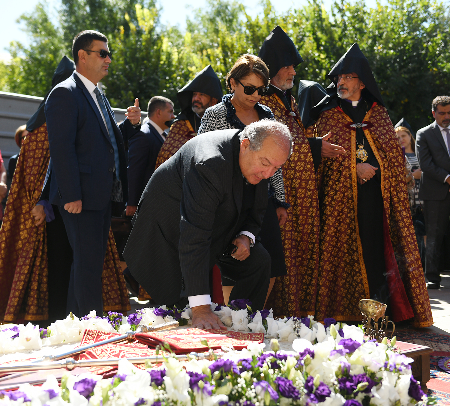President Armen Sarkissian and Mrs. Nouneh Sarkissian today at the Holy See of Saint Etchmiadzin were present at the ceremonies dedicated to the memory and the 20th anniversary of passing away of the blessed memory Garegin I, His Holiness Catholicos of All Armenians. His Holiness Supreme Patriarch and Catholicos of All Armenians Garegin II led a memorial service after which President Sarkissian gave a eulogy.
