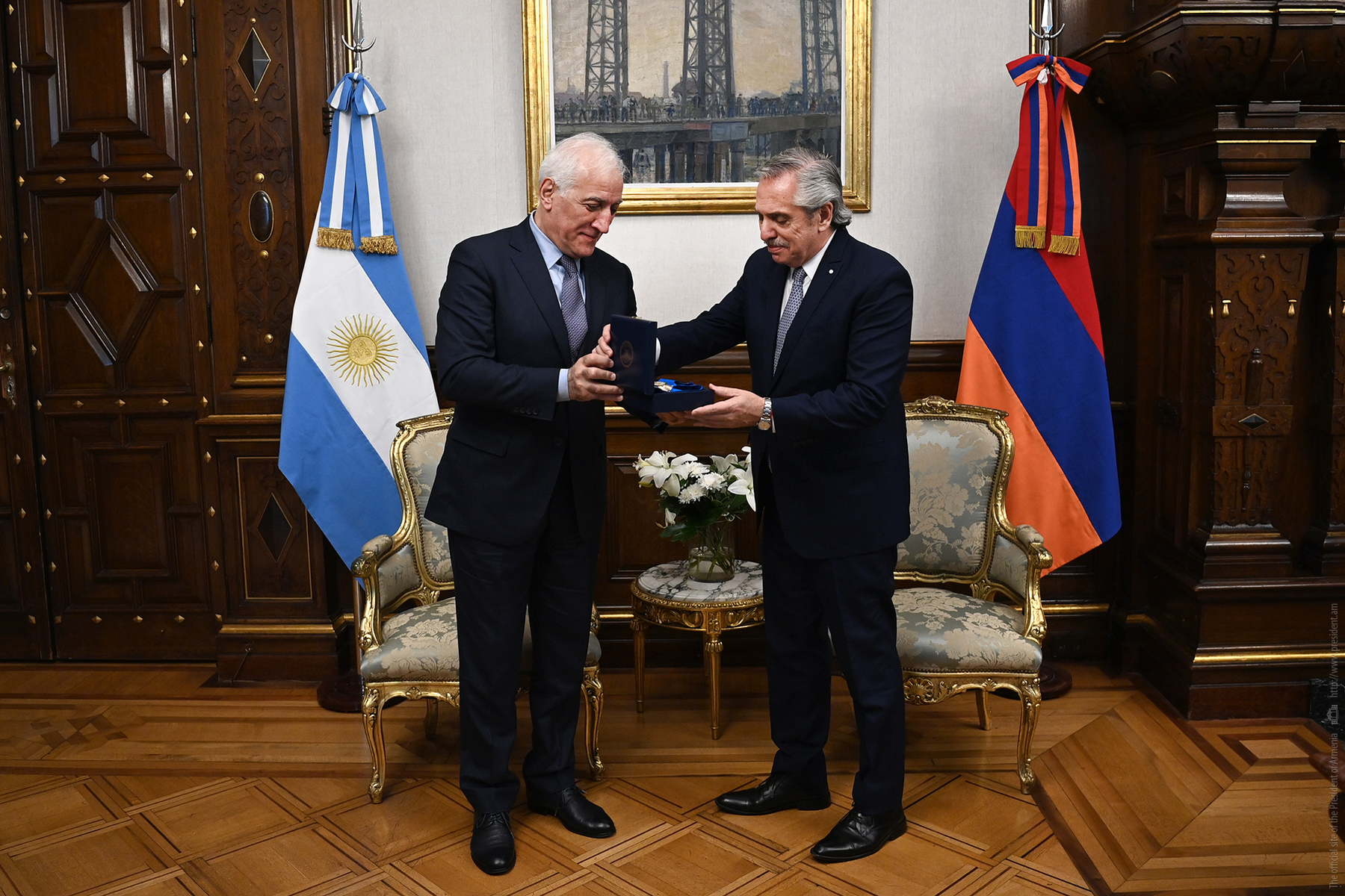 À la fin de la réunion, le président Vahagn Khatchatourian a remis la médaille d'honneur au président sortant Alberto Fernández.