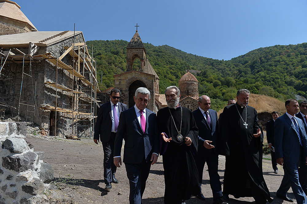 Նախագահներ Սերժ Սարգսյանը և Բակո Սահակյանը Արցախի թեմի առաջնորդ գերաշնորհ Պարգև Սրբազանի հետ այցելել են նաև Դադիվանք՝ ծանոթացել վանական համալիրում իրականացվող վերականգնողական աշխատանքների ընթացքին և մոմ վառել Դադիվանքի Սբ. Աստվածածին Կաթողիկե եկեղեցում:
