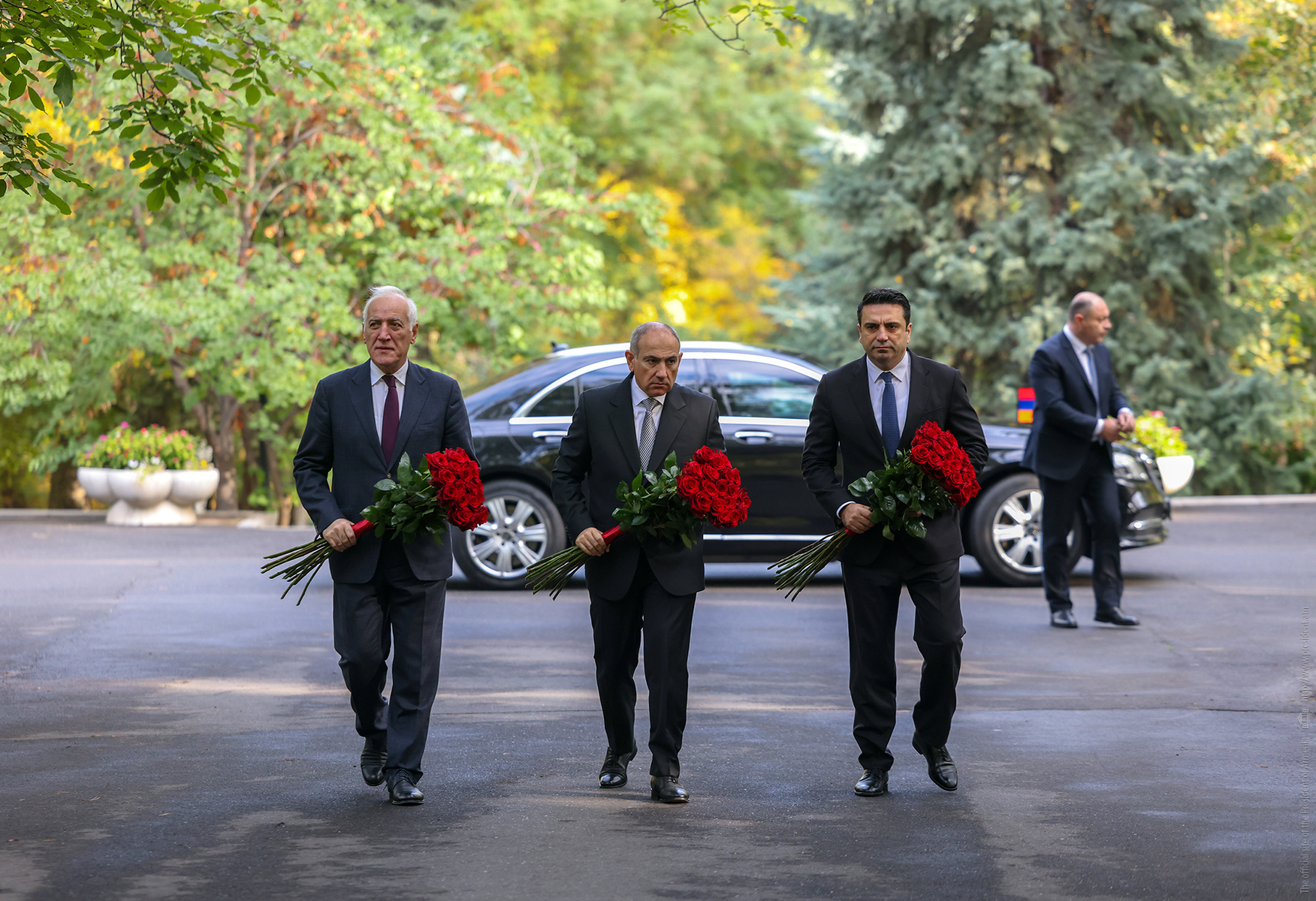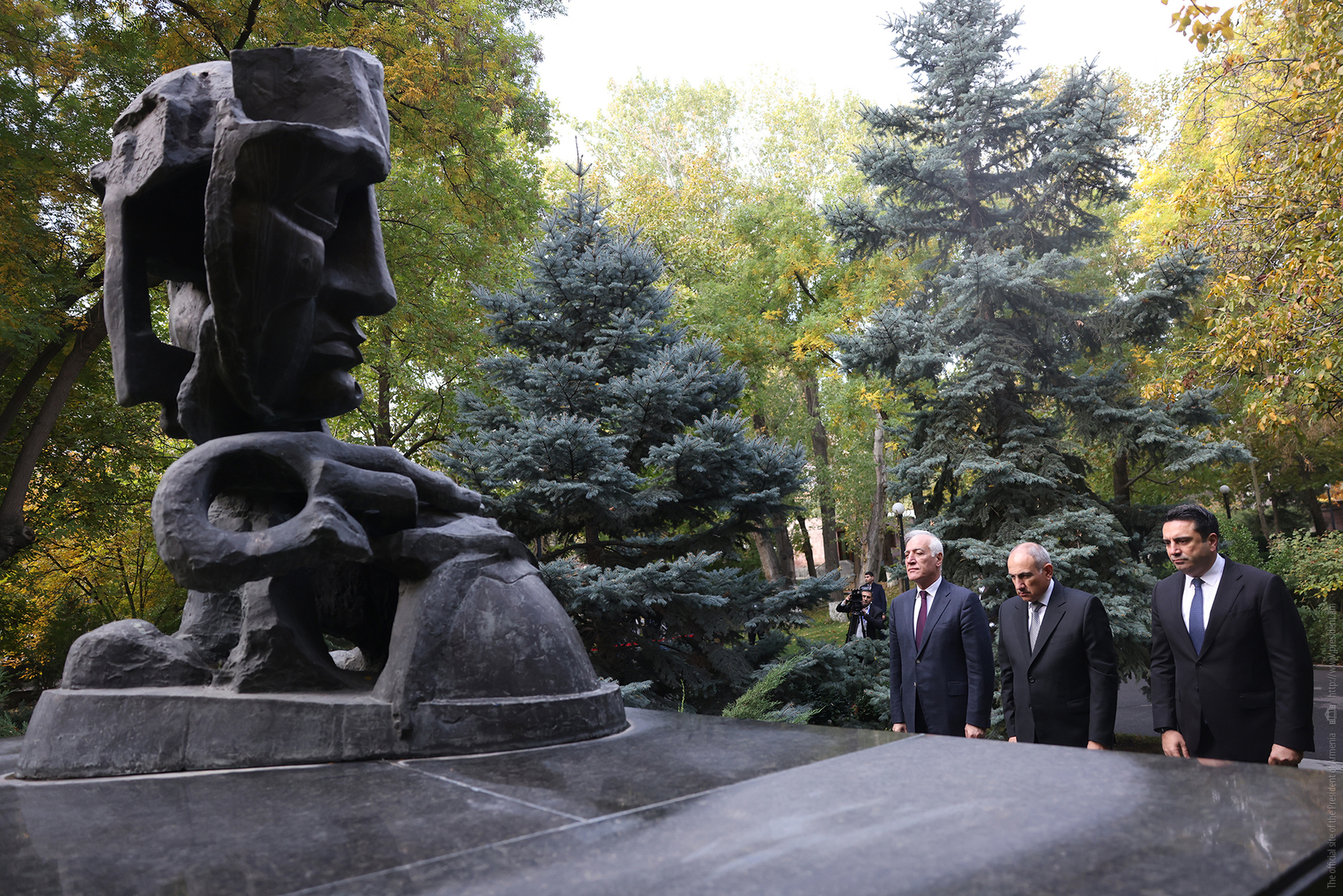 Հանրապետության նախագահ Վահագն Խաչատուրյանը վարչապետ Նիկոլ Փաշինյանի և Ազգային ժողովի նախագահ Ալեն Սիմոնյանի հետ ծաղիկներ է խոնարհել ԱԺ այգում 1999 թվականի ահաբեկչության զոհերի հուշակոթողի մոտ և հարգանքի տուրք մատուցել ոճրագործության զոհ դարձած պետական և քաղաքական գործիչների հիշատակին: