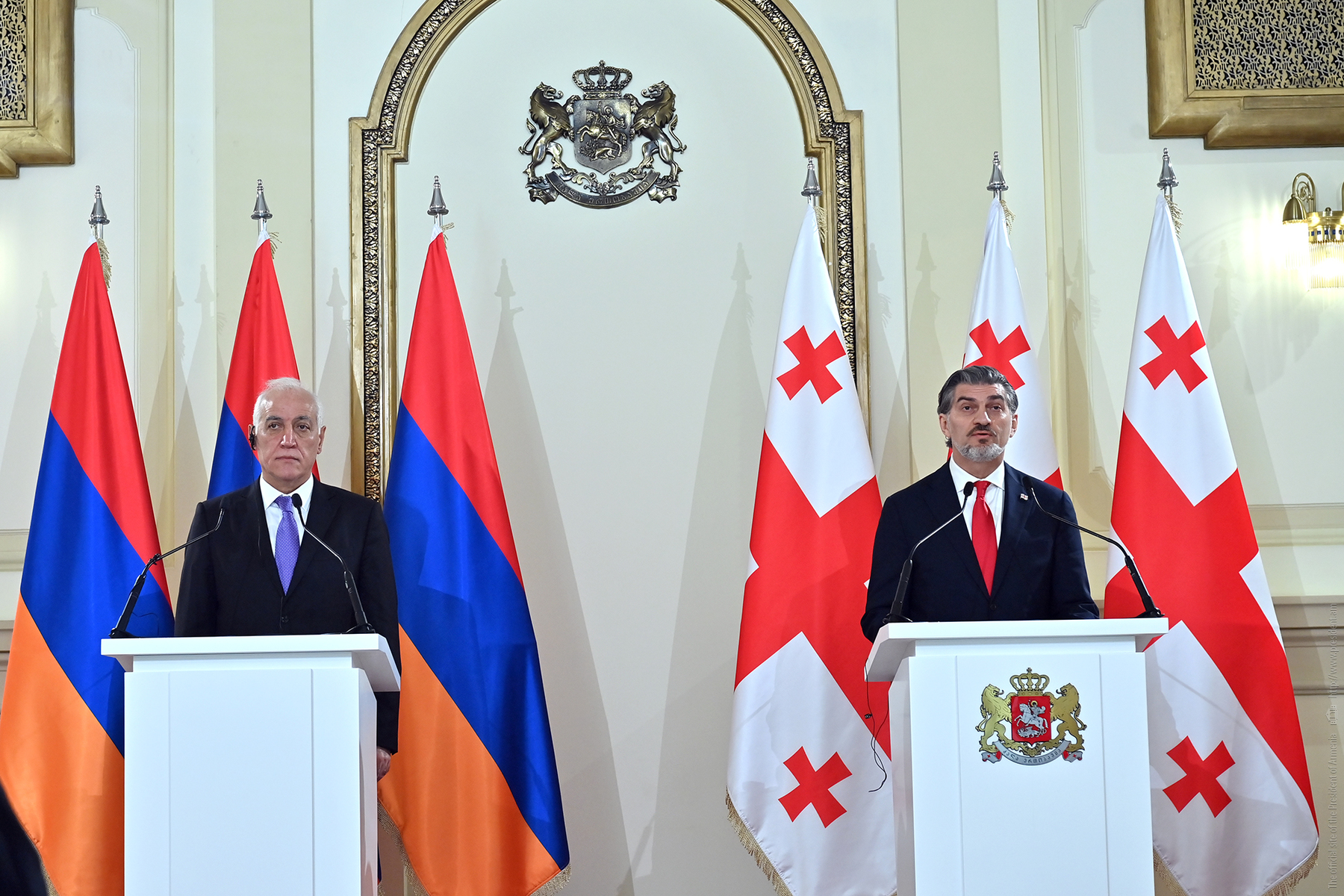 Հանրապետության նախագահ Վահագն Խաչատուրյանը և Վրաստանի նախագահ Միխեիլ Կավելաշվիլին Թբիլիսիում տեղի ունեցած հանդիպումների արդյունքներն ամփոփել են զանգվածային լրատվամիջոցների ներկայացուցիչների համար հայտարարություններով: