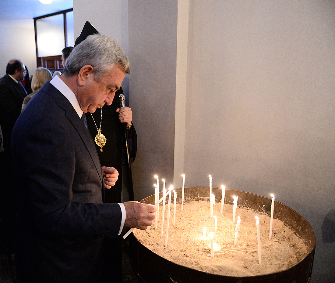 Президент возложил венок к находящемуся во дворе церкви памятнику, увековечивающему память жертв Геноцида армян и воздал дань уважения.