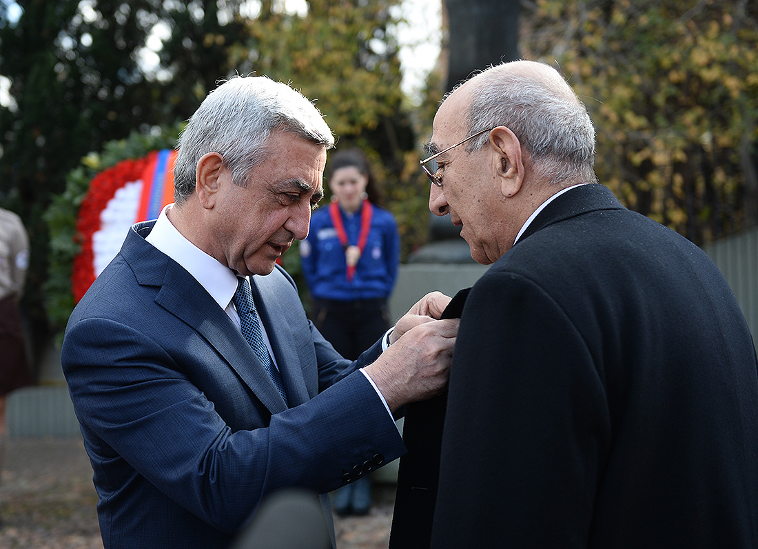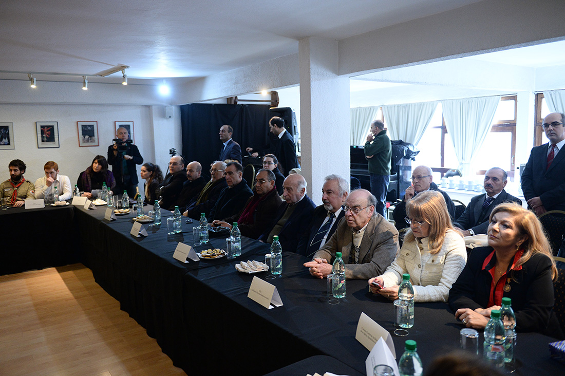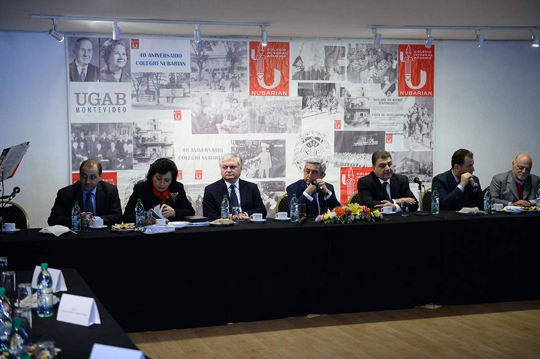 Президент Серж Саргсян затем в гимназии Нубарян АОБС встретился с представителями организаций армянской общины Уругвая и благотворителями. За значимый вклад в дело укрепления связей Армения-диаспора и сохранения армянства, а также активную общественную и благотворительную деятельность представитель АРФД и Ай дата Уругвая Арпи Очачанян, благотворитель Карапет Пилавджян, Министр туризма и спорта Восточной Республики Уругвай Лилиам Кешишян указом Президента РА награждены медалями Мовсеса Хоренаци. Президент за значимый вклад в дело признания Геноцида армян наградил медалью Мхитара Гоша сенатора Рафаеля Микелина и депутата Парламента Уругвая Рубена Мартинеса Уелмо. Серж Саргсян вручил государственные награды РА, поздравил их и пожелал успехов.