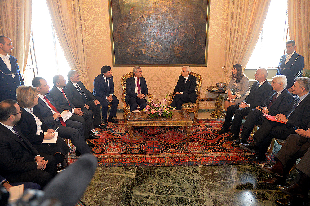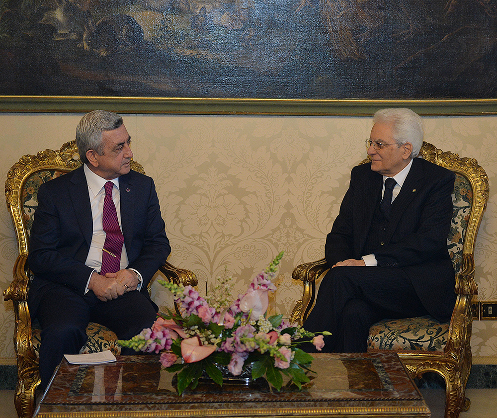 Придавая важное значение встрече с Серджио Матареллой спустя короткий срок после его вступления в должность Президента Италии, Президент РА выразил надежду, что она будет способствовать дальнейшему расширению диалога и армяно-итальянской повестки дня. Президент Серж Саргсян выразил уверенность, что его официальный визит с насыщенной повесткой дня придаст новый стимул дружественным армяно-итальянским отношениям.