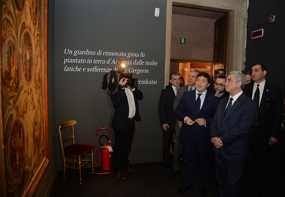 После встречи с Мэром Рима Президент Серж Саргсян посетил музейный комплекс Витториано, где посмотрел посвященную 100-летней годовщине Геноцида армян выставку «Армения: народ Ковчега», на которой представлены 3000-летняя история Армении и ряд материалов, свидетельствующих о присутствии армян в Италии. Этой выставкой в Италии стартовали мероприятия, посвященные 100-летней годовщине Геноцида армян, на ней специальным разделом представлены также свидетельства этого преступления.