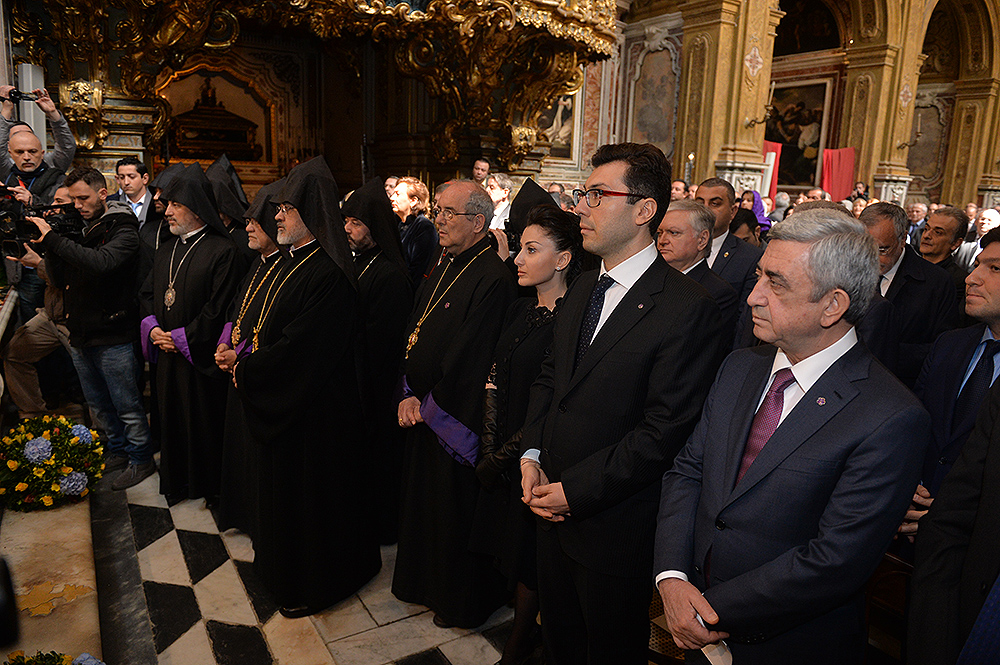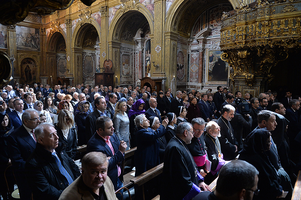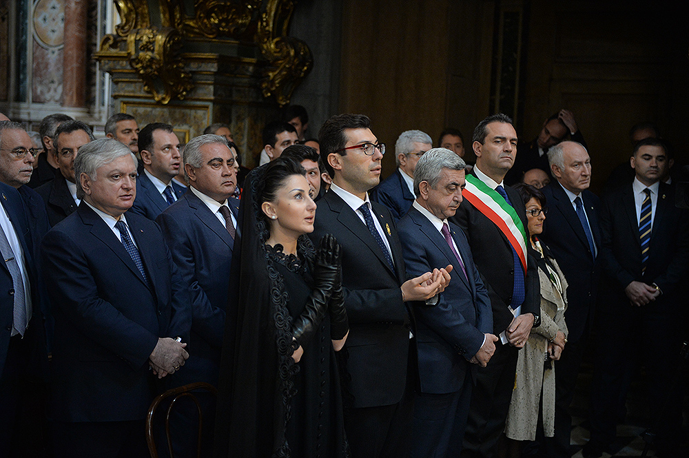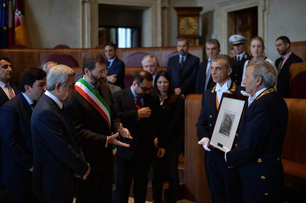 Коснувшись мероприятий, посвященных 100-летней годовщине Геноцида армян, Президент Серж Саргсян отметил, что в курсе, что как и во многих уголках мира, и в Риме проводятся и до конца года будут проводиться многочисленные мероприятия, посвященные 100-летней годовщине Геноцида армян. Президент высоко оценил единогласное признание в 2000 году Геноцида армян Городским советом Рима. По словам Президента, признание Геноцида армян на уровне более 60 региональных и городских советов Италии Армения рассматривает в качестве проявления как приверженности общечеловеческим ценностям, так и солидарности с армянским народом. В этом контексте Серж Саргсян счел неслучайным также тот факт, что в «Вечном городе» установлена мемориальная доска, увековечивающая память невинных жертв Геноцида армян.