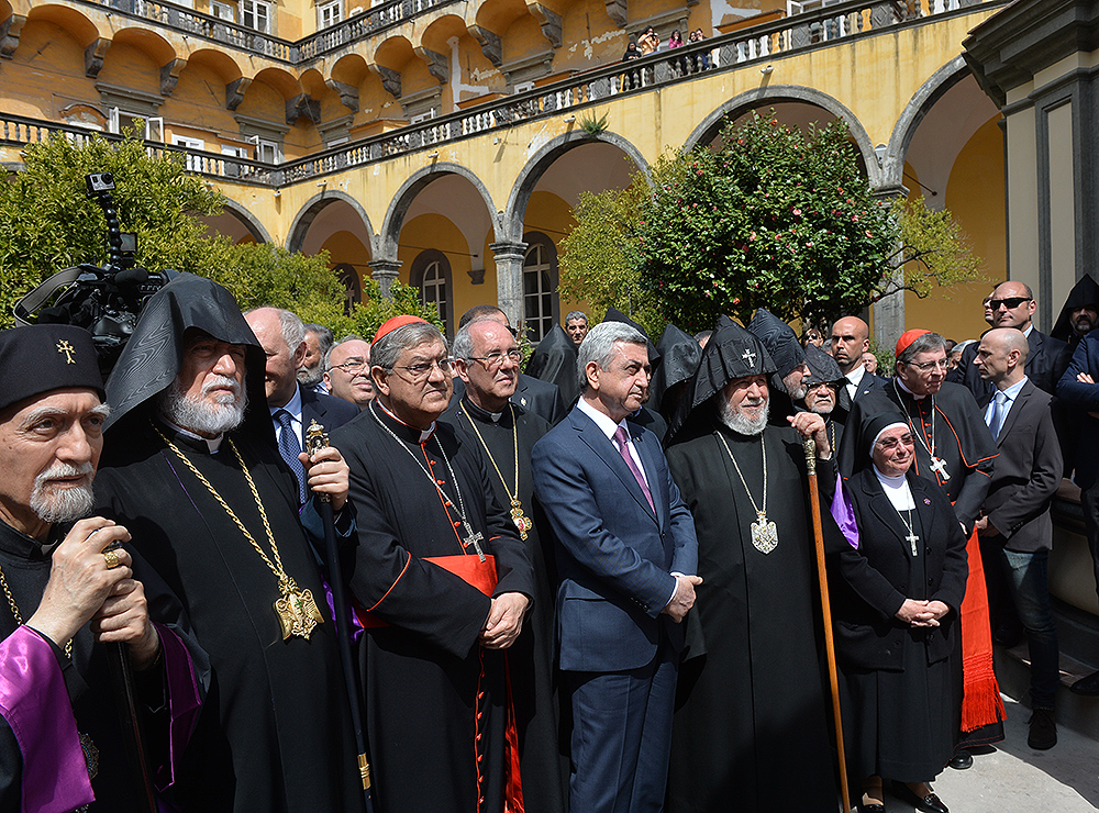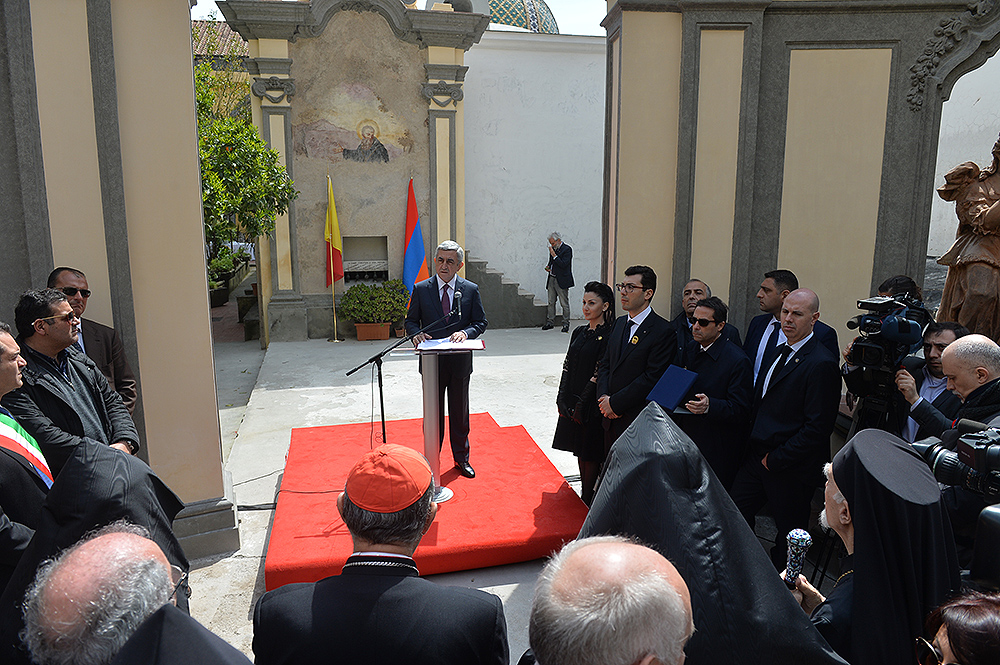 Президент Серж Саргсян 11 апреля в церкви Святого Григория Просветителя итальянского города Неаполя присутствовал на проведенной Его Святейшеством Верховным Патриархом и Католикосом Всех Армян Гарегином Вторым и кардиналом Сепе церковной церемонии и церемонии открытия и освящения посвященного Геноциду армян памятника – хачкара, являющегося копией одного из хачкаров Джуги. Президент Республики в связи с открытием хачкара и возвращением мощей Святого Григория Просветителя выступил с речью.