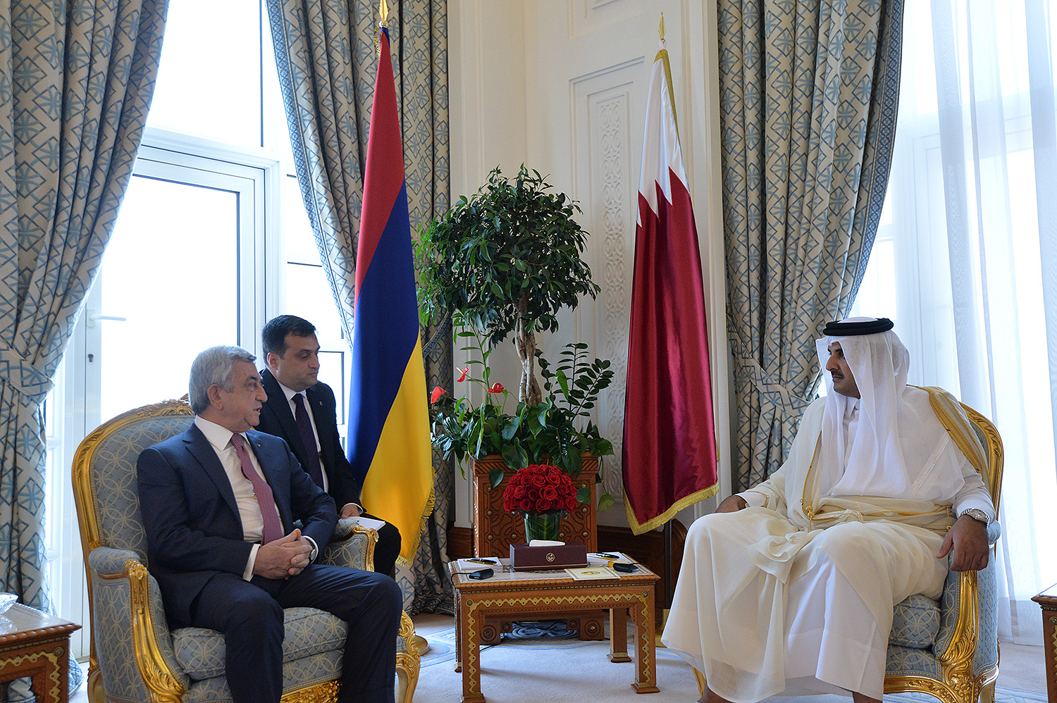 Находящийся с официальным визитом в Государстве Катар Президент Серж Саргсян встретился с Эмиром Катара Тамимом бин Хамадом Аль Тани. В резиденции Эмира до этого состоялась официальная церемония встречи Президента Республики Армения.