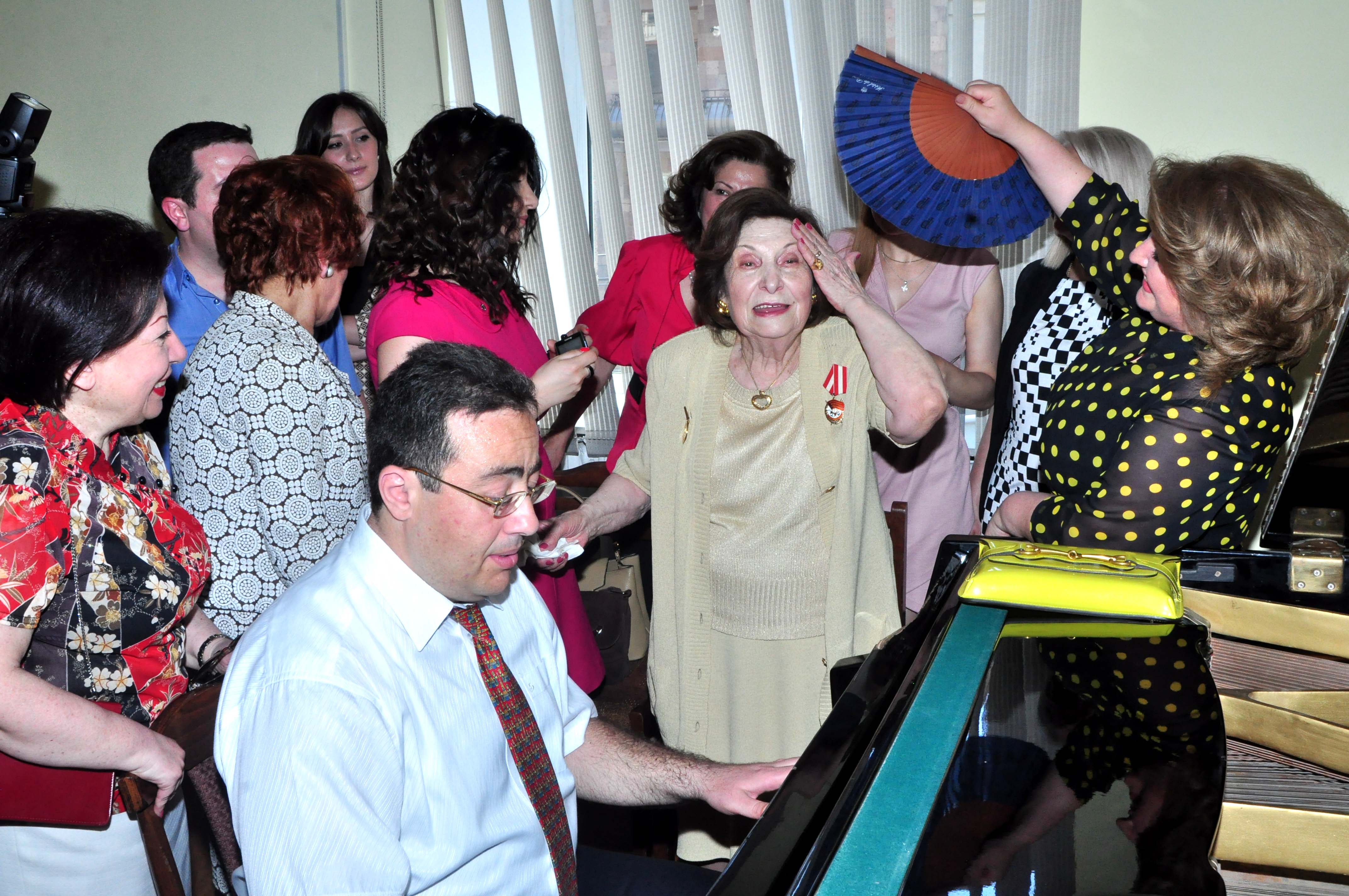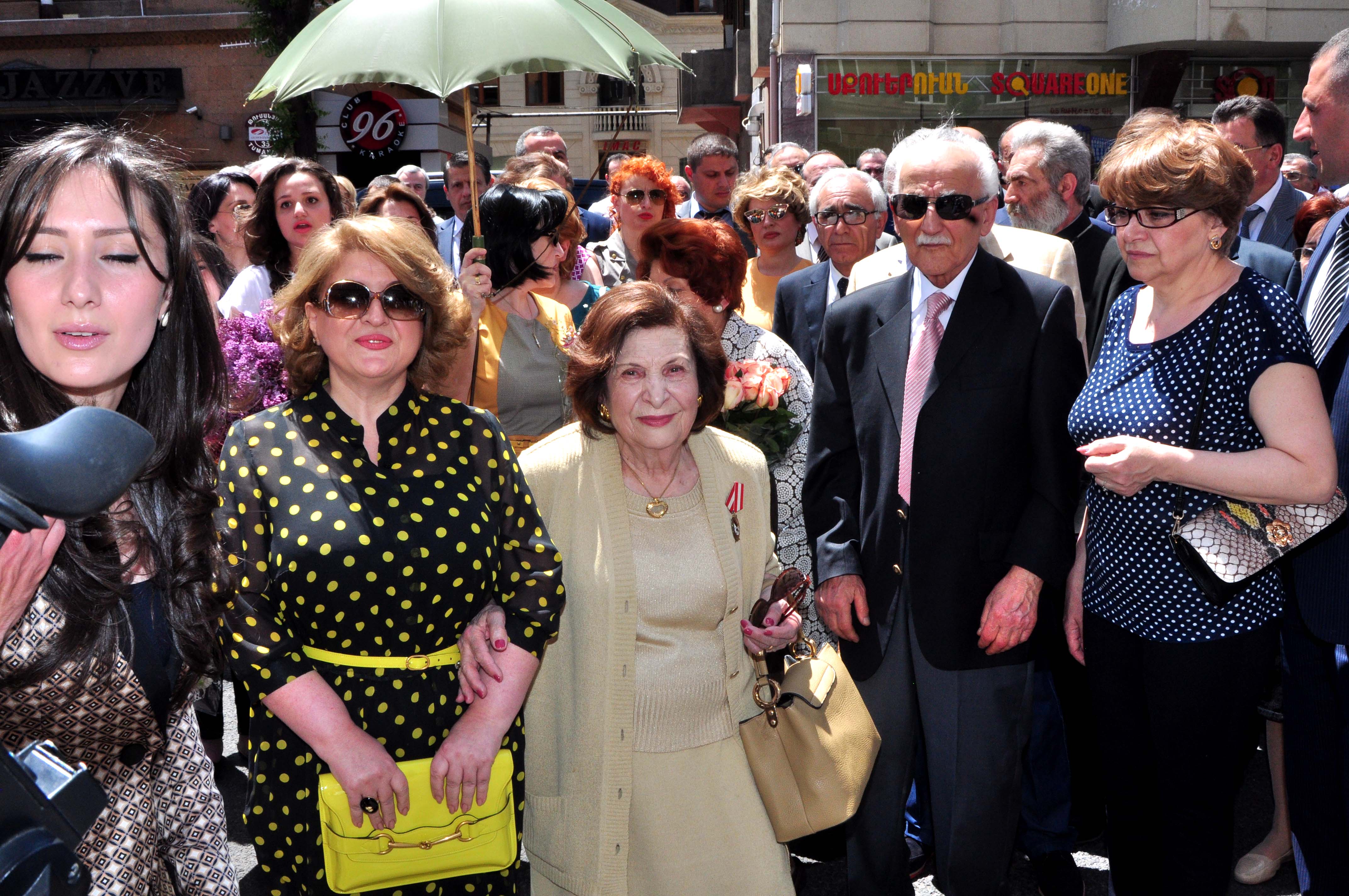 Первая леди Армении Рита Саргсян присутствовала на церемонии открытия мемориальной доски легендарного разведчика Геворка Варданяна у второго корпуса Ереванского лингвистического университета, на которой присутствовала и вдова разведчика Гоар Варданян.