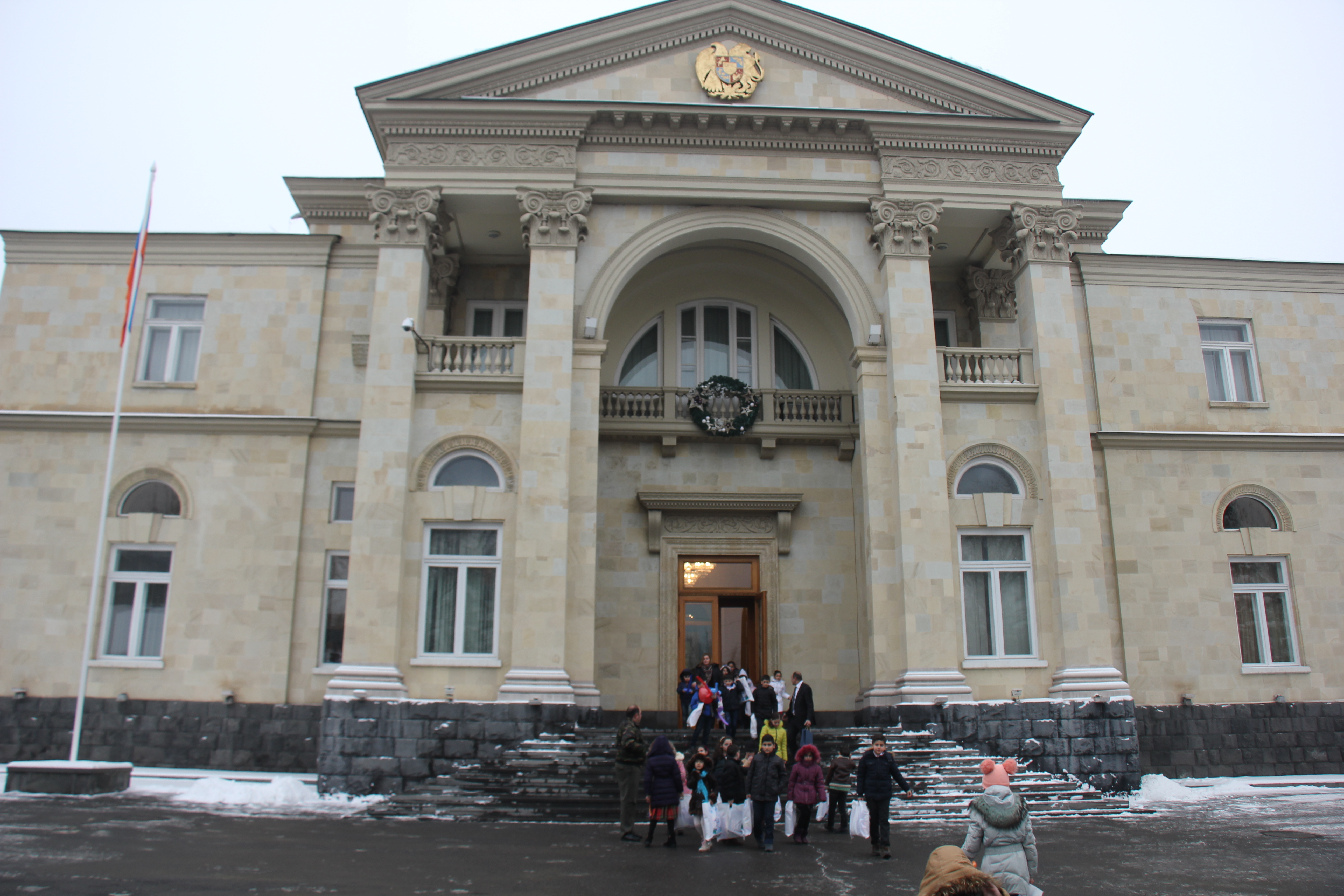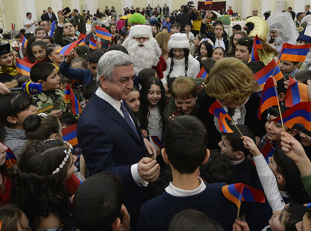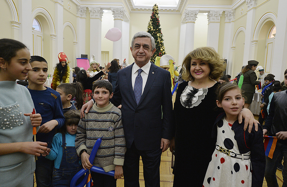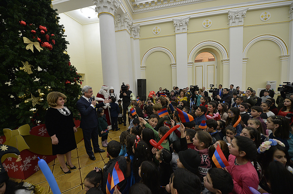 Президент Серж Саргсян и госпожа Рита Саргсян в резиденции Президента в связи с наступающими праздниками Нового года и святого Рождества сегодня приняли детей и внуков из семей военнослужащих ВС РА; солдат, которые погибли или стали инвалидами в Арцахской освободительной войне, а также в Апрельской четырёхдневной войне; членов Союза ополченцев-добровольцев "Еркапа"; сотрудников Полиции РА и Службы национальной безопасности РА; членов ряда сотрудничающих с Министерством обороны РА общественных организаций, в том числе из Нагорно-Карабахской Республики.