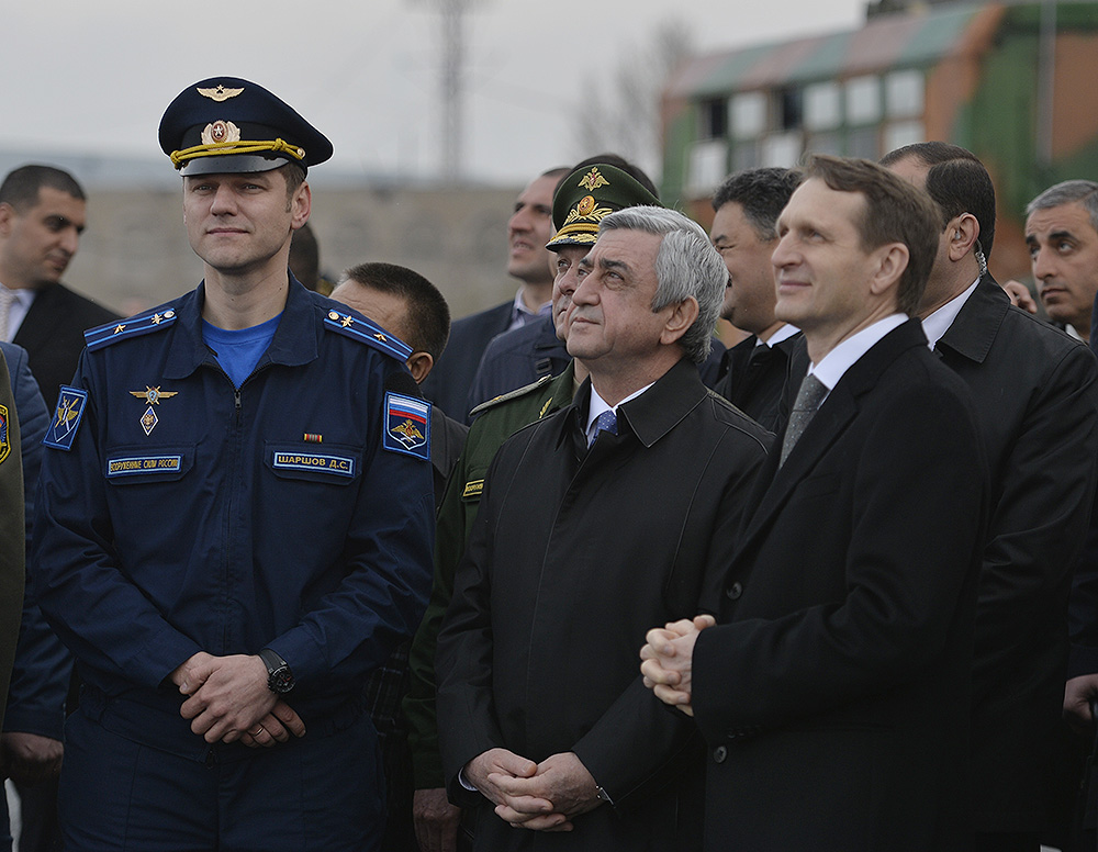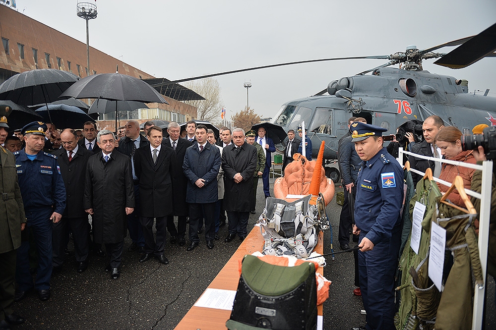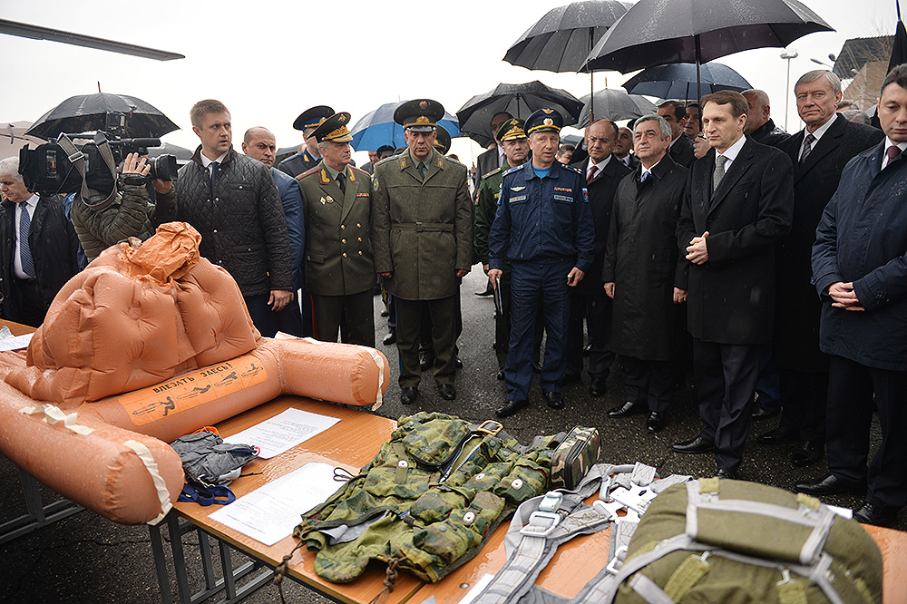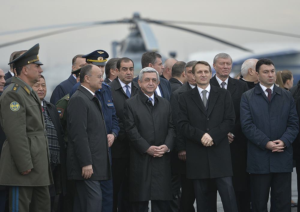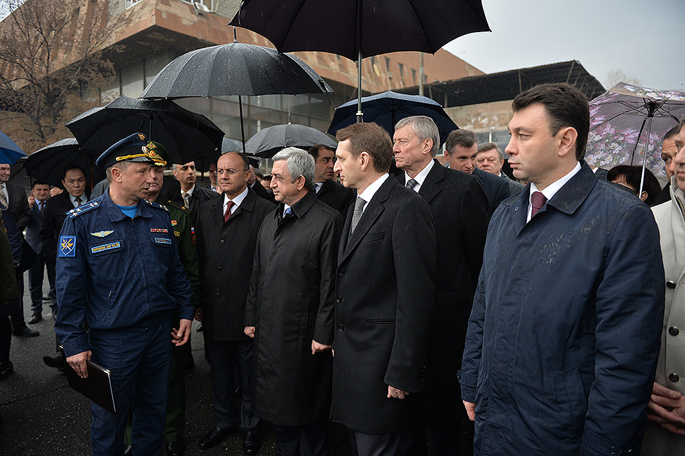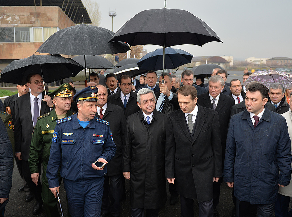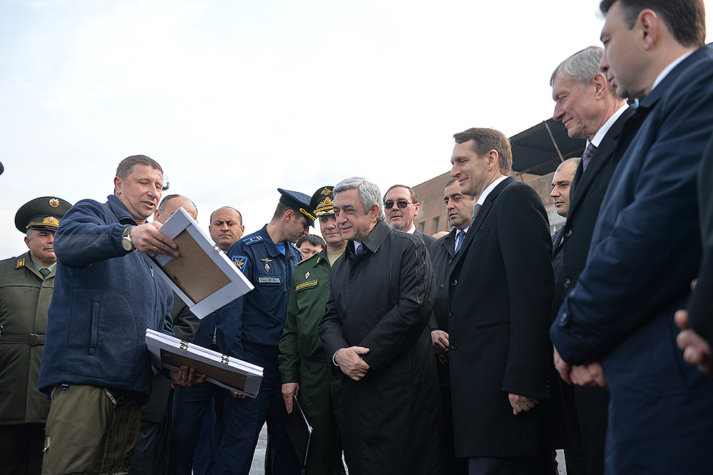Президент Серж Саргсян в сопровождении Председателя Совета Парламентской Ассамблеи Организации Договора о коллективной безопасности, Председателя Государственной Думы Федерального Собрания РФ Сергея Нарышкина, представителей парламентских делегаций выездного заседания Совета, Генерального секретаря ОДКБ Николая Бордюжи, Министра обороны РА Сейрана Оганяна, соответствующих должностных лиц оборонных ведомств Армении и России сегодня посетил дислоцированную в столичном аэропорту «Эребуни» совместную военно-воздушную авиабазу Армении и России. Представители военно-воздушных сил представили посетителям авиабазы экспозицию современных образцов вооружения, военной техники и экипировки экипажей воздушных судов, после чего Президент Республики и сопровождающие его члены делегаций посмотрели показательные полеты истребителей в рамках осуществления задач ОДКБ.