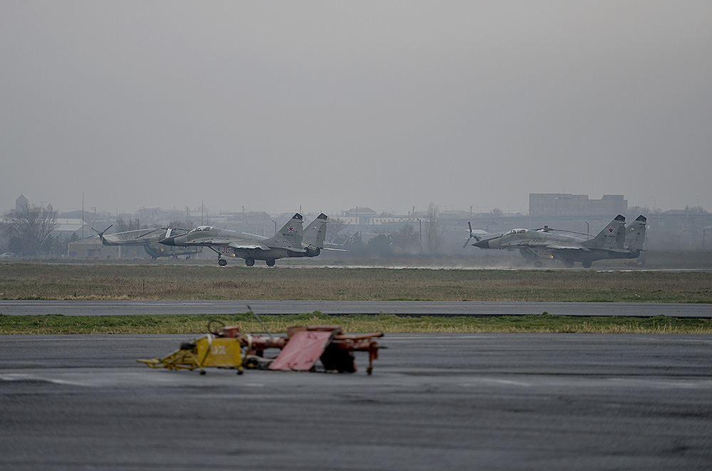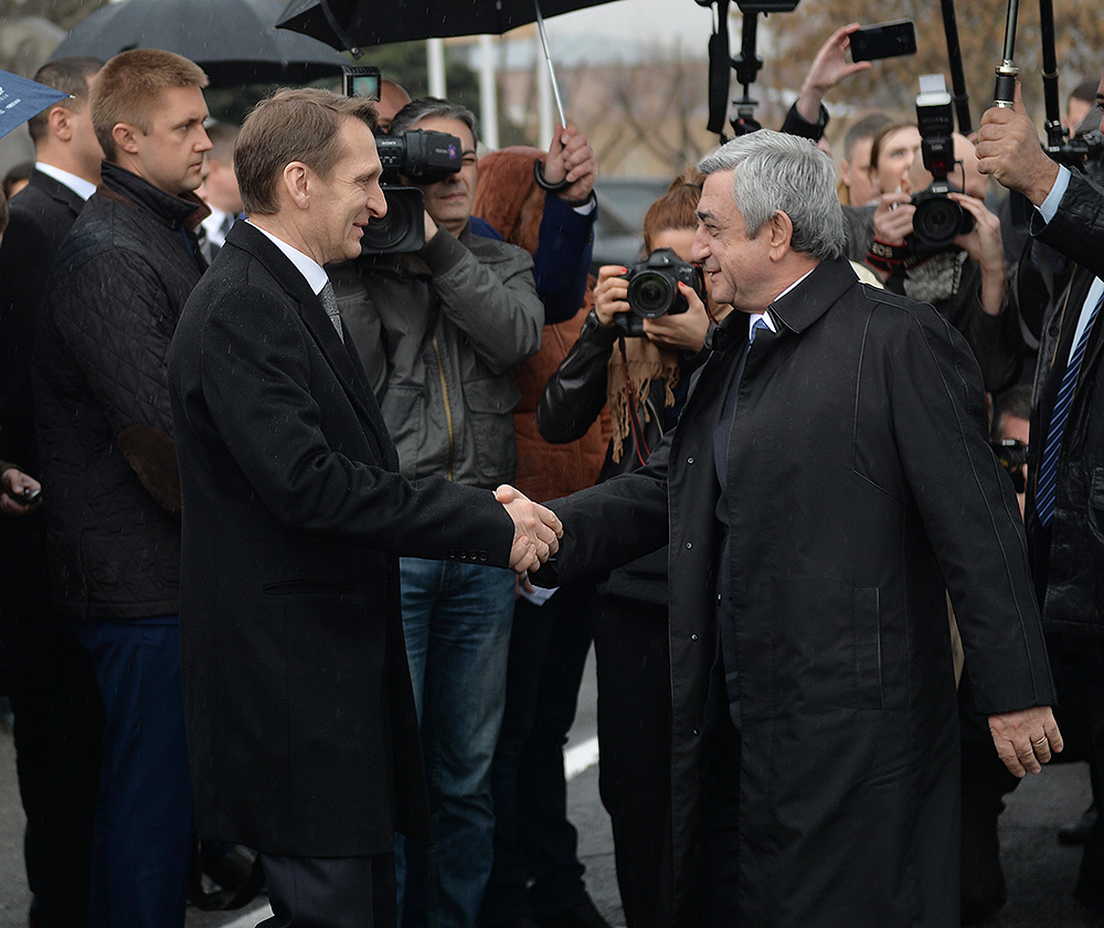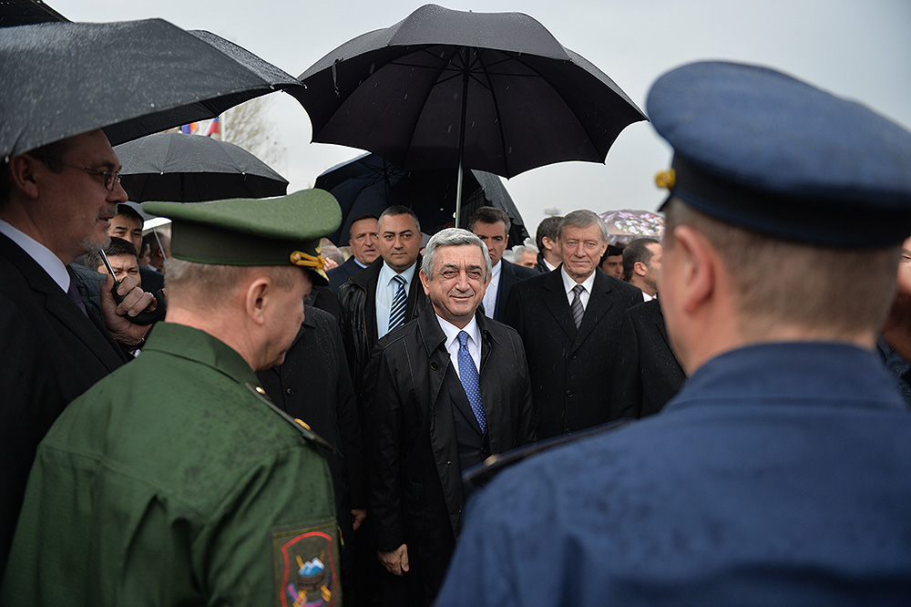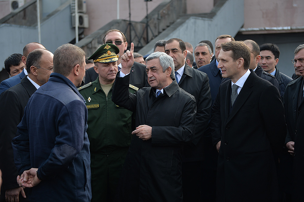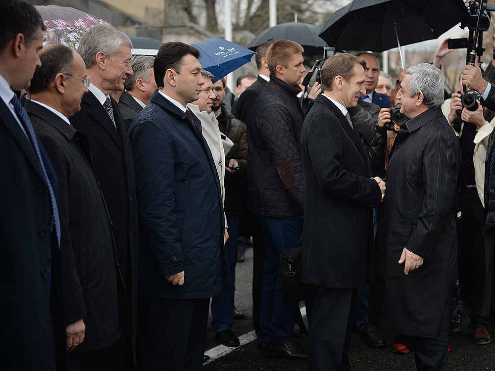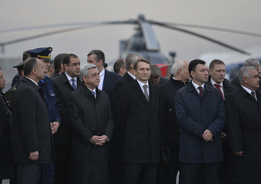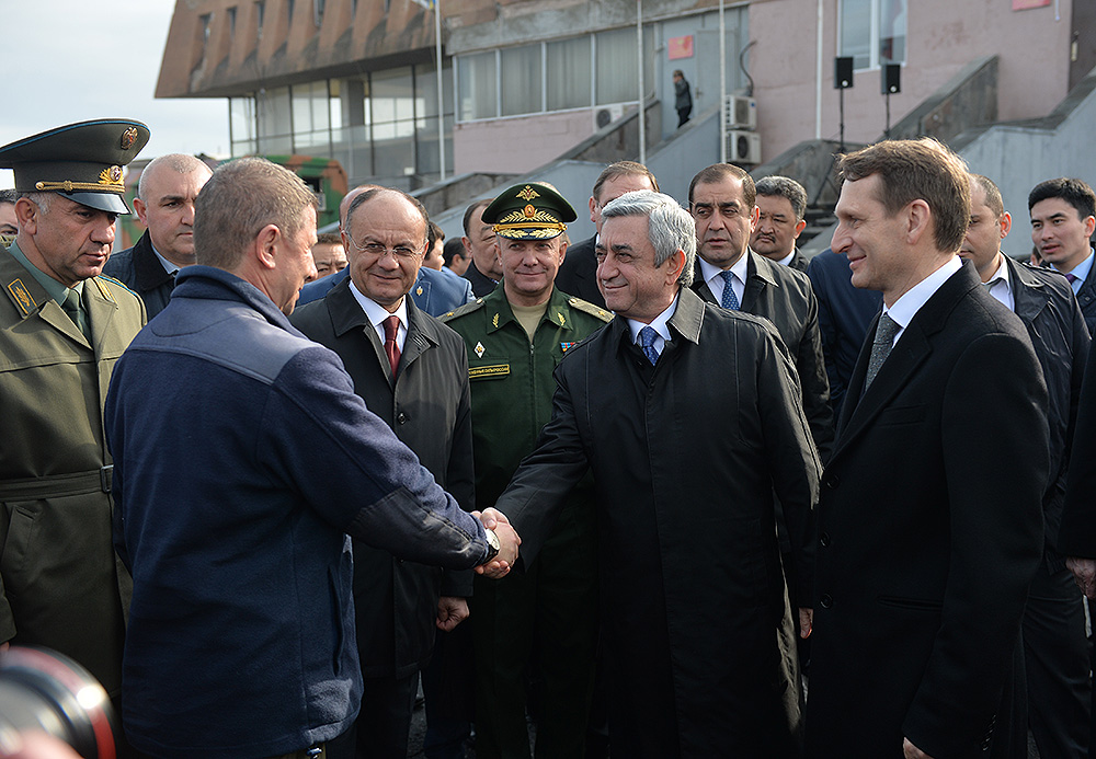 Президент Серж Саргсян в сопровождении Председателя Совета Парламентской Ассамблеи Организации Договора о коллективной безопасности, Председателя Государственной Думы Федерального Собрания РФ Сергея Нарышкина, представителей парламентских делегаций выездного заседания Совета, Генерального секретаря ОДКБ Николая Бордюжи, Министра обороны РА Сейрана Оганяна, соответствующих должностных лиц оборонных ведомств Армении и России сегодня посетил дислоцированную в столичном аэропорту «Эребуни» совместную военно-воздушную авиабазу Армении и России. Представители военно-воздушных сил представили посетителям авиабазы экспозицию современных образцов вооружения, военной техники и экипировки экипажей воздушных судов, после чего Президент Республики и сопровождающие его члены делегаций посмотрели показательные полеты истребителей в рамках осуществления задач ОДКБ.
