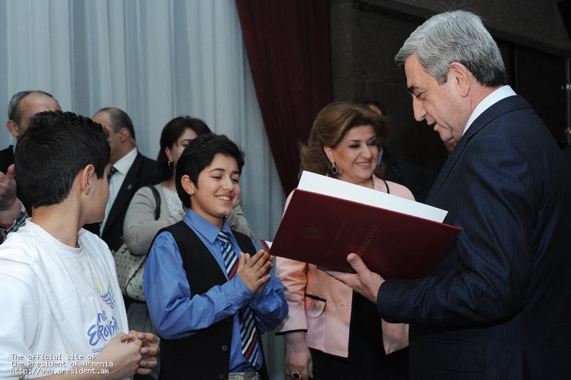 For brilliant victory and for the most dignified presentation of Armenia at the Junior Evrovision-2010, Vladimir Arzumanian received a letter of commendation from the President. Serzh Sargsyan also presented Vladimir and his dancing group with gifts and wished that that first success became a starting point for every success in their lives.
