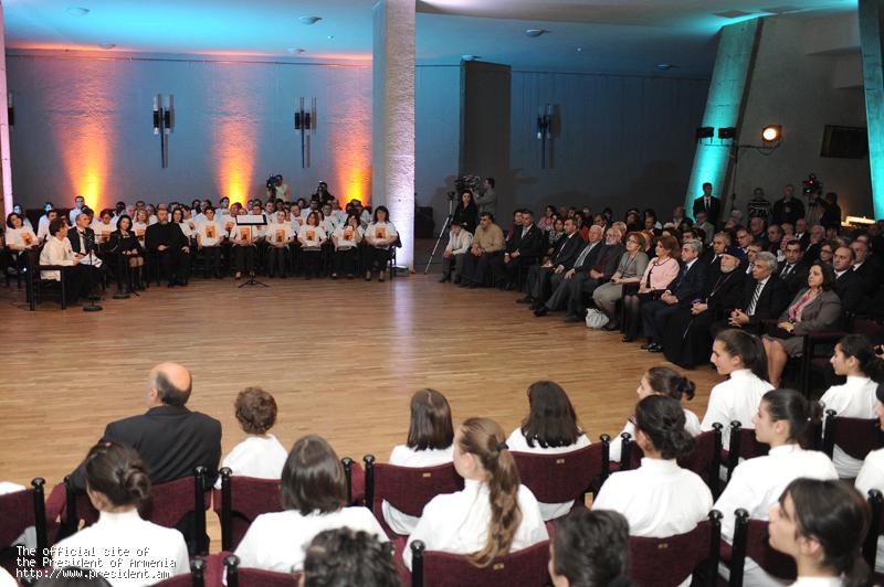Today, at the Komitas Chamber Music Hall President Serzh Sargsyan attended the final event of festive celebrations dedicated to the 140th birthday anniversary of Komitas. Events dedicated to the jubilee included “To Komitas…” recital, presentation of the multimedia DVD “Komitas – life and work” electronic book, CDs on life and creative life of Komitas as well as books – “Komitas in the reflections of the contemporaries” musical monograph, illustrated album dedicated to Vardapet Komitas, musical collections for choral and solo performance, as well as Komitas’s entire collection of choral and spiritual pieces performed by the Chamber Music Choir of Armenia.