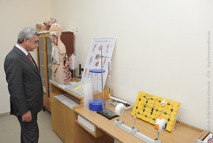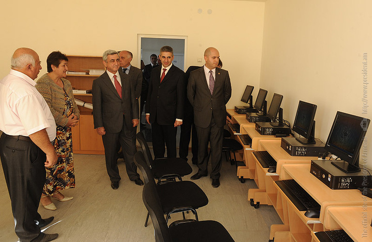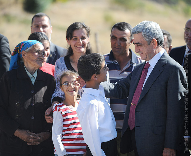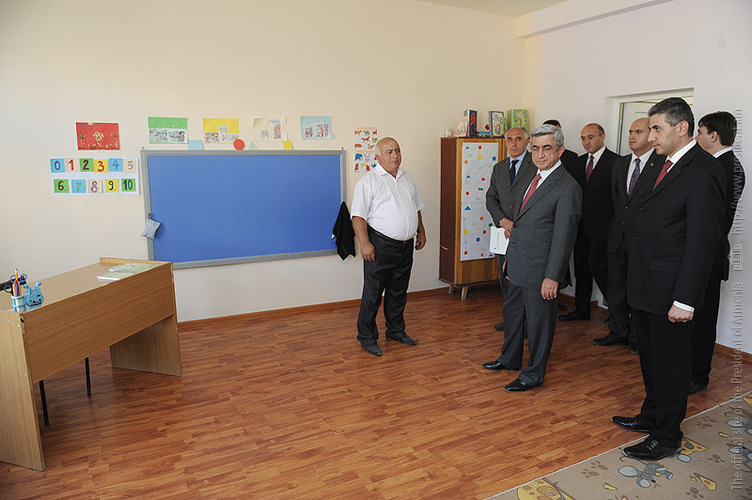 In another border community of the marz – Khatchik, President Serzh Sargsyan visited the construction site of the house being built for the large family of Abrahamians, familiarized with the works and planted a nut tree in the backyard. Serzh Sargsyan participated also at the opening ceremony of the newly renovated secondary school. During the tour of the school premise, President Sargsyan observed the quality of the works, conditions in this educational institution and in the pre-school which was opened here last year.
