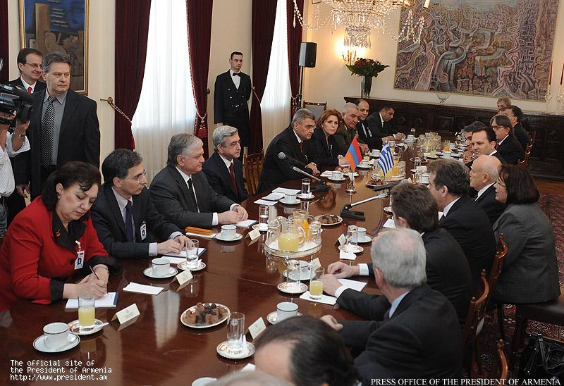 After the official ceremony of welcoming the President of Armenia, Presidents Serzh Sargsyan and Karolos Papoulias held a private meeting, which was followed by the meeting with the participation of the delegations.
