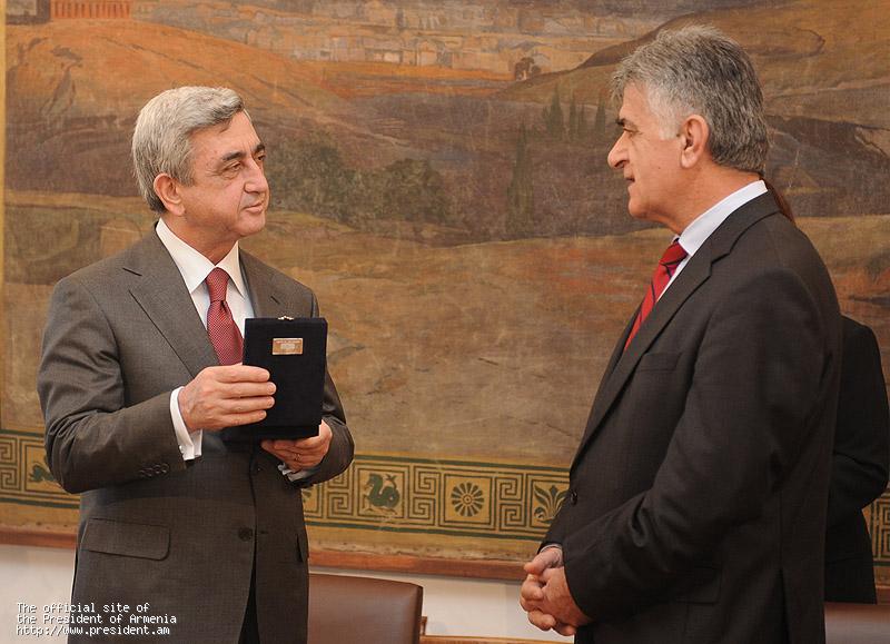 Filippos Petsalnikos handed to the President of Armenia the Gold Medal of the Hellenic Parliament, which bears a representation of the head of Pericles, the founder of the Athenian Democracy.