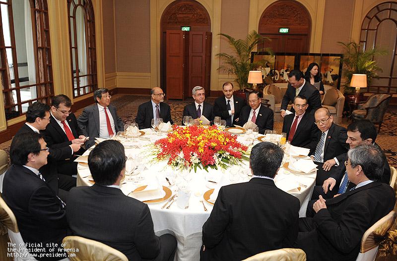 At the meeting with the leading businessmen and heads of the most powerful corporations of Singapore, President Serzh Sargsyan discussed prospects of making investments in Armenia. The representatives of the business community of Singapore were particularly interested in the opportunities for cooperating with Armenia in the areas of information technologies, telecommunications, health care, urban development and programming, construction of hydro-energy stations, waste management and water resources. At the meeting with Serzh Sargsyan, it was agreed that the Armenian businessmen will visit Singapore in the nearest future for the purpose of translating negotiations and intentions into concrete programs.