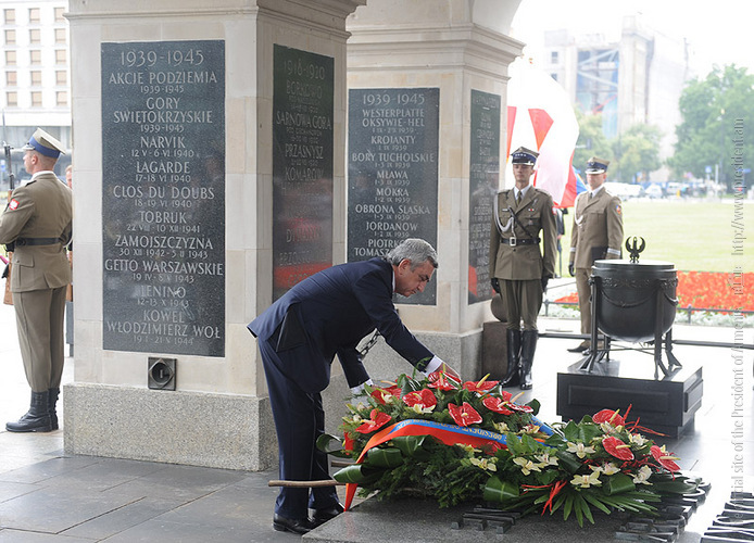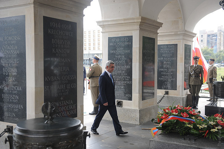 President Serzh Sargsyan in Warsaw visited the Memorial of the Unknown Soldier, laid a wreath and paid tribute to the fallen. After signing the Visitor’s Book, President Serzh Sargsyan together with the President of Poland also laid flowers and paid tribute at the memorial plate of Yadviga Zarugievich, who was born in an Armenian-Polish family. This Armenian woman, whose son had been killed in the war, was given this honor because on October 29, 1925 she had been entrusted with the privilege to choose the remnants of an unknown soldier to be interred in Warsaw Memorial which is considered Poland’s national symbol.