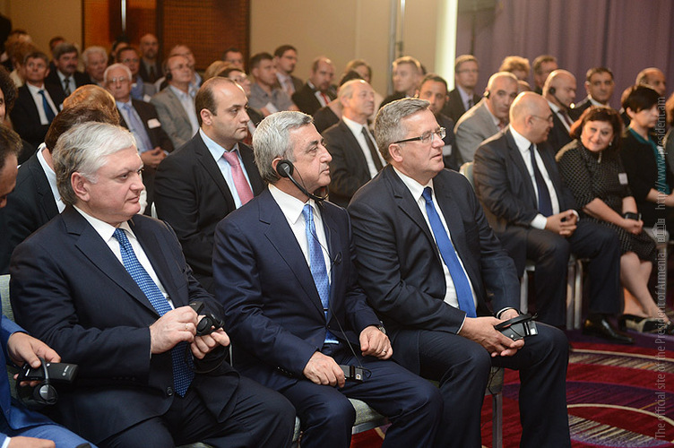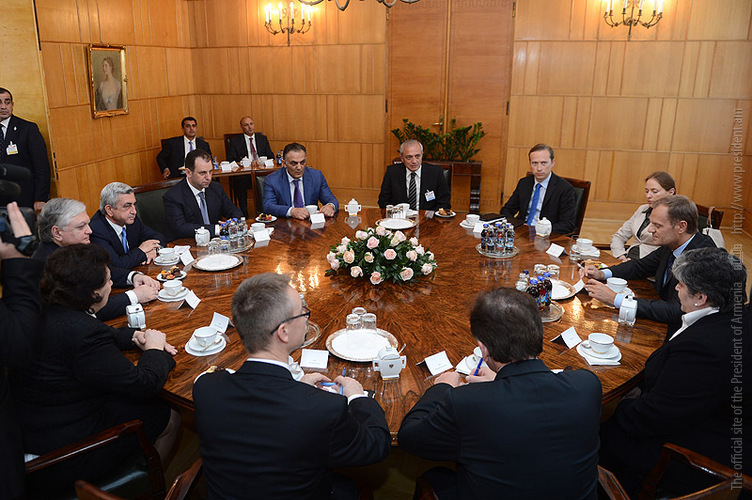 The President of Armenia and Prime Minister Donald Tusk mentioned with satisfaction that the bilateral relations have registered considerable progress: there took place sessions of the Armenian-Polish intergovernmental commission, business forums and the interagency cooperation has also become more dynamic. At the same time, they underlined that there is still great potential to be utilized, particularly in the trade and economic area. At the meeting, the parties stressed the importance of establishing a closer cooperation between the governments and different agencies of the executive branch and discussed issues related to the prospects of the expansion of the Polish business presence in Armenia. The President of Armenia and Prime Minister of Poland spoke also about the Armenia-EU negotiations on the Association Agreement and the process of implementation in Armenia of comprehensive reforms.
