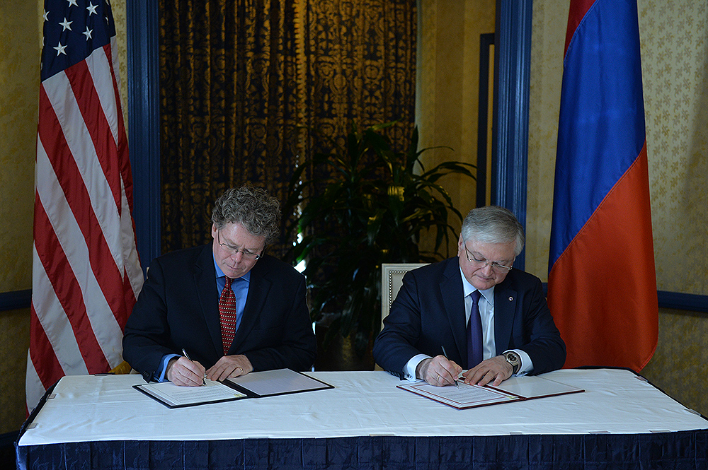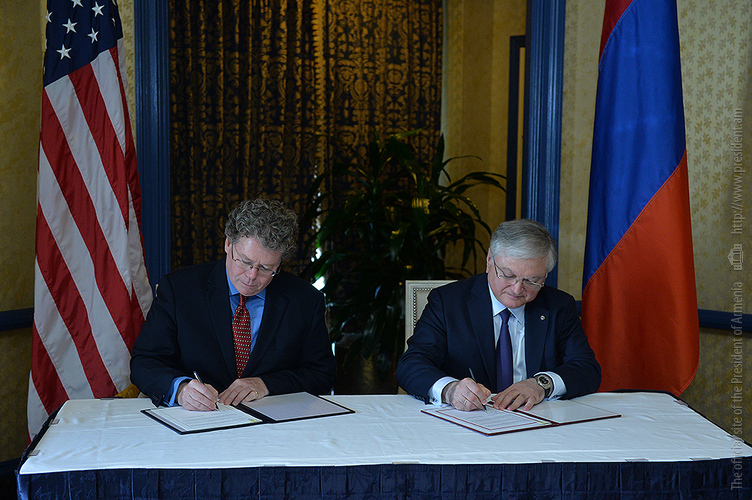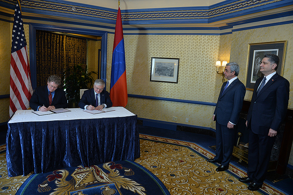President Serzh Sargsyan, who has paid a working visit to the United States of America, attended the signing ceremony of the Trade and Investment Framework Agreement between the Government of the Republic of Armenia and the Government of the United States of America. The document was signed by RA Foreign Minister Edward Nalbandian representing the RA government and Assistant United States Trade Representative Dan Mullaney representing the U.S. government.