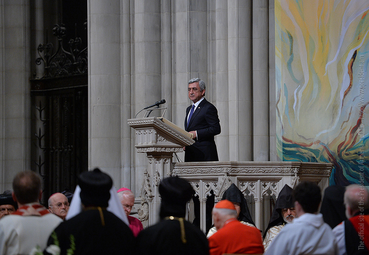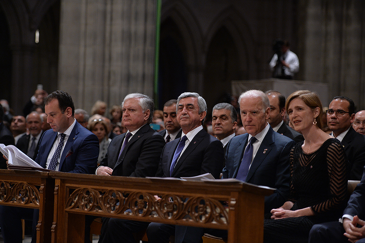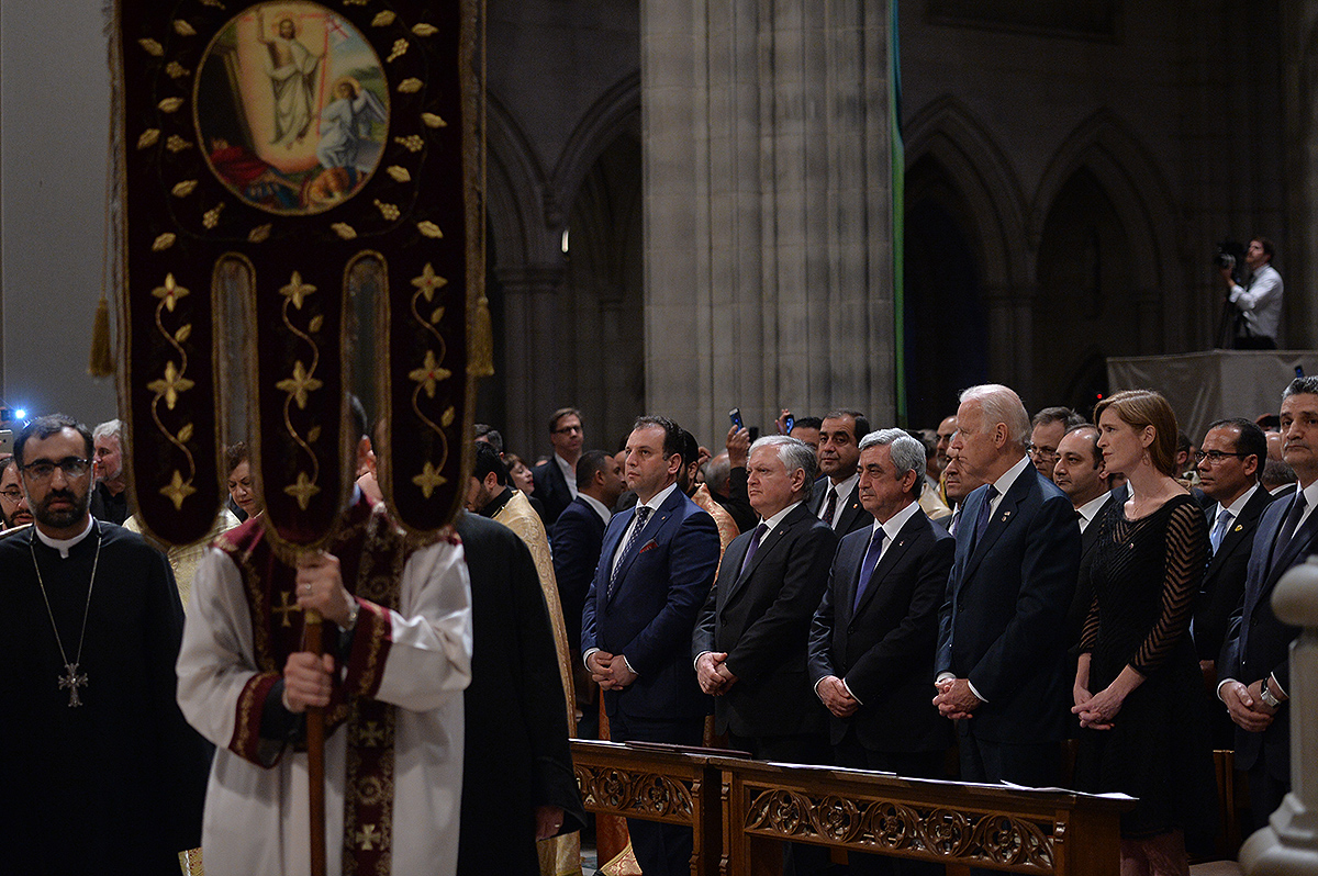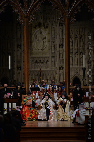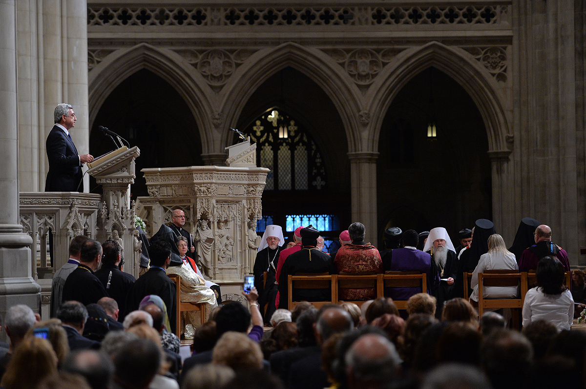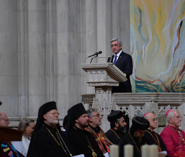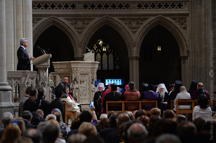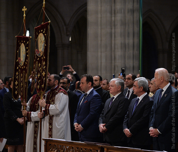 On the evening of May 7, President Serzh Sargsyan, who has paid a working visit to the United States of America, took part in an ecumenical prayer in memory of the Armenian Genocide victims which was performed at Washington National Cathedral. The president was accompanied by His Holiness Karekin II, Supreme Patriarch and Catholicos of All Armenians, and Aram I, Catholicos of the Great House of Cilicia. The Armenian president delivered a speech. The ecumenical prayer service was also joined by U.S. Vice-President Joe Biden, U.S. Ambassador to the UN Samantha Power, Katharine Schori, Presiding Bishop of the Episcopal Church of the United States, Olav Fykse Tveit, Secretary-General of the World Council of Churches, numerous clergymen, thousand members of the Armenian-American community, American diplomats, as well as by public and political figures.
