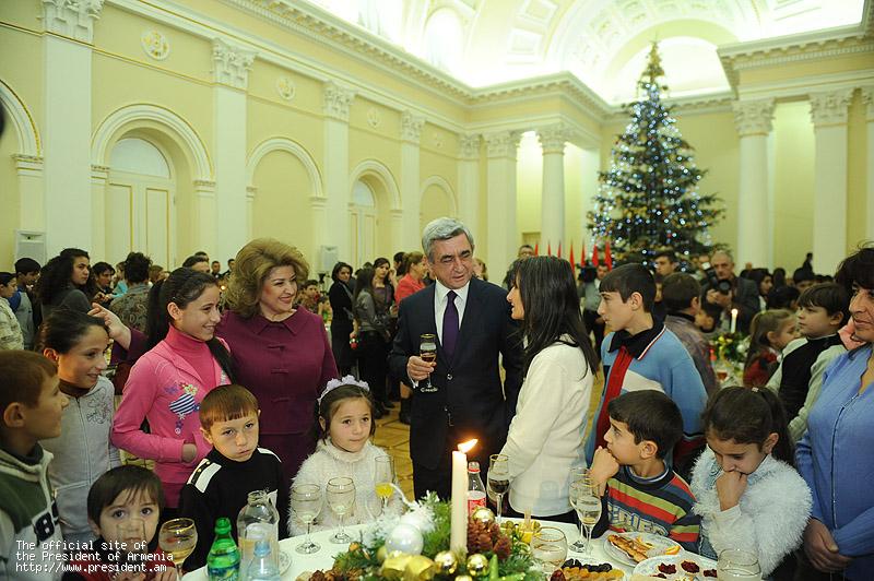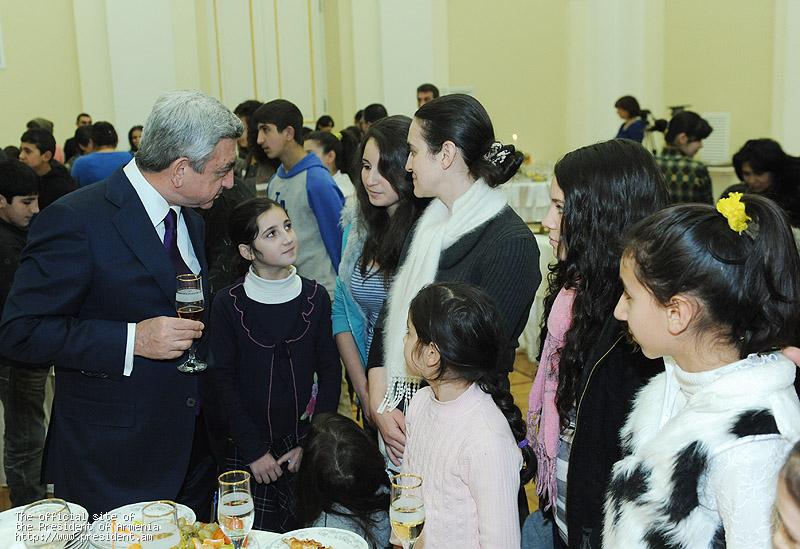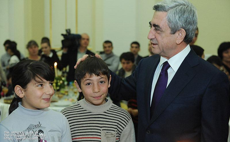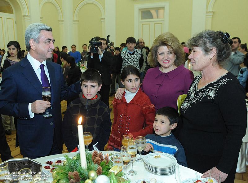 President and Mrs. Sargsyan congratulated them on the upcoming holidays and wished them all the best. The President of Armenia underscored that any problem is solvable if there are mutual affection and respect in the family. “These children are our independence generation. Recently, we have celebrated in a stately manner the 20th anniversary of Armenia’s independence. I have no doubt, moreover, I am confident that we will hand over to these children a more prosperous, stronger statehood because each generation has to fulfill its mission, solve its problems, so that subsequent generation builds up on the existing basis because nothing can be built if there is no solid foundation. I am also confident that in 15-20 years, many of those gathered here today will become high state officials, military commanders, diplomats, teachers, doctors, great professionals who will be able to inspire their fellow citizens with hope and faith, enroot kindness because kindness and solidarity can solve any problem,” President Sargsyan said.