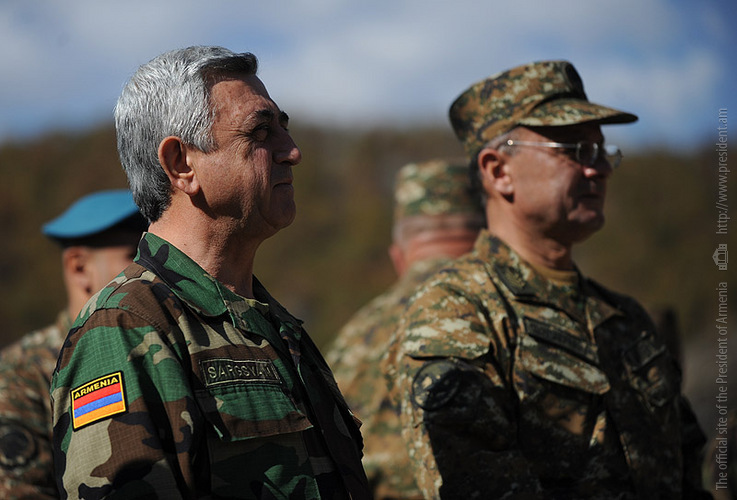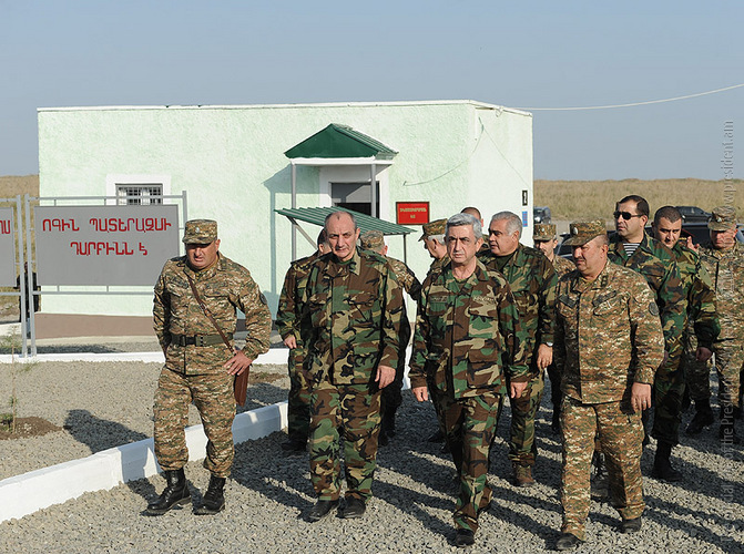 The Presidents of Armenia and Artsakh were present at the military exercises carried out by the NKR Defense Army and conducted monitoring of the defense area. In one of the military units, Presidents Serzh Sargsyan and Bako Sahakian participated also at the inauguration of Saint Gevorg church. Later, they conducted a meeting with the participation of the high military command.