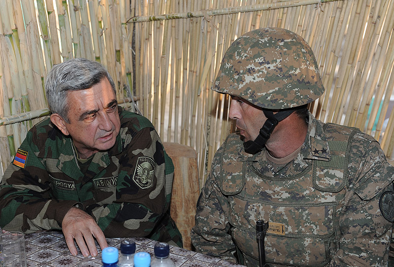 Serzh Sargsyan and President of the NKR Bako Sahakian, RA Minister of Defense Seiran Ohanian, accompanied by the representatives of the high command visited the defense positions, familiarized first hand with the combat readiness of the troops and ongoing army building works.