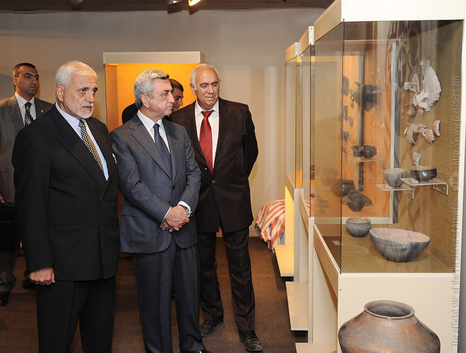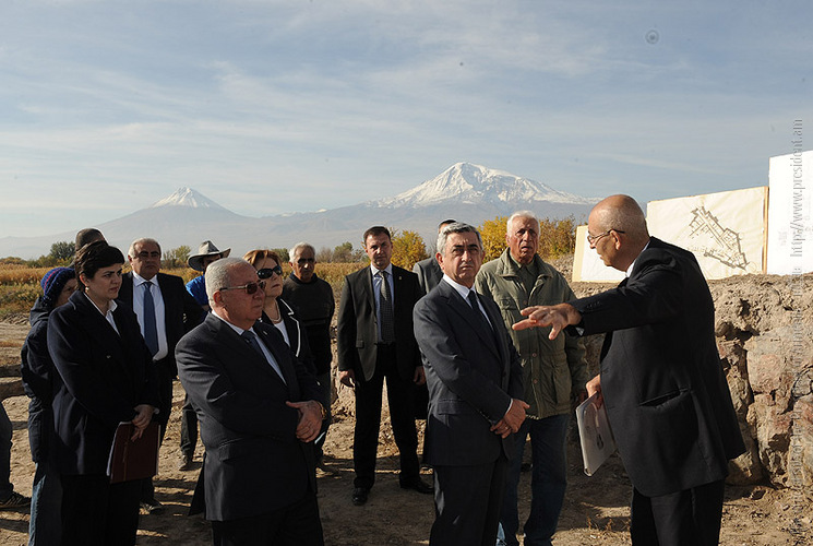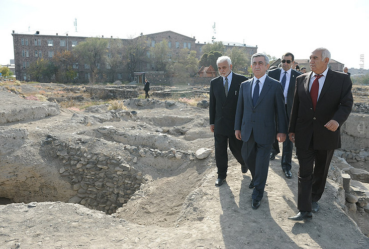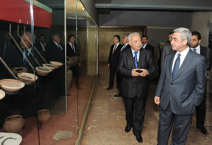 Shengavit, which is located In the south-western part of Yerevan on the left bank of Hrazdan river, is one of the most significant ancient sites of the Early Bronze Age (36-25 BC) in Armenia, where new excavations and research are being conducted. After familiarizing with the results of the archeological works, Serzh Sargsyan visited Erebuni historical and scientific refuge-museum. He observed its permanent exhibition and “Journey: Erebuni Yesterday and Today” temporary exhibition. It represents on a small scale the scientific journey taken by the ancient town- fortress, from regular excavations which started 50 years ago, up until 2008 when the joint Armenian-French excavations started.