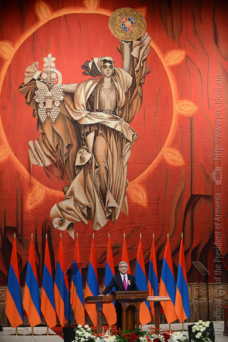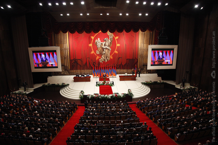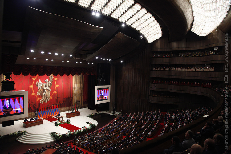Today, during the extraordinary session of the National Assembly of Armenia, which took place at the Karen Demirjian Sport and Concert Complex, the newly elected President Serzh Sargsyan assumed the office of President of Armenia. During the oath taking ceremony he said, “Assuming the office of President of the Republic of Armenia, I swear to unreservedly fulfill requirements of the Constitution to respect human and civil rights and freedoms, to safeguard independence of the Republic, its territorial integrity and security for the glory of the Republic of Armenia and for the benefit of the people of the Republic of Armenia.”