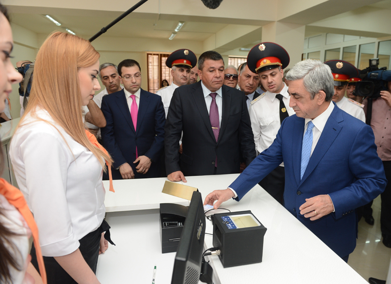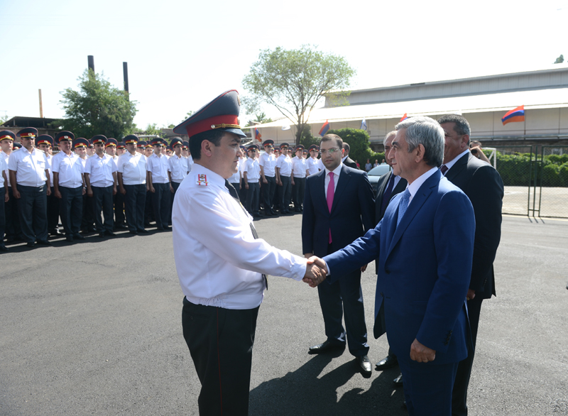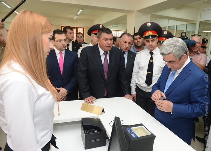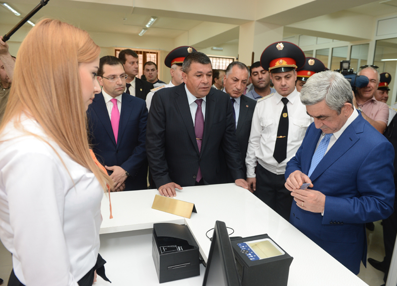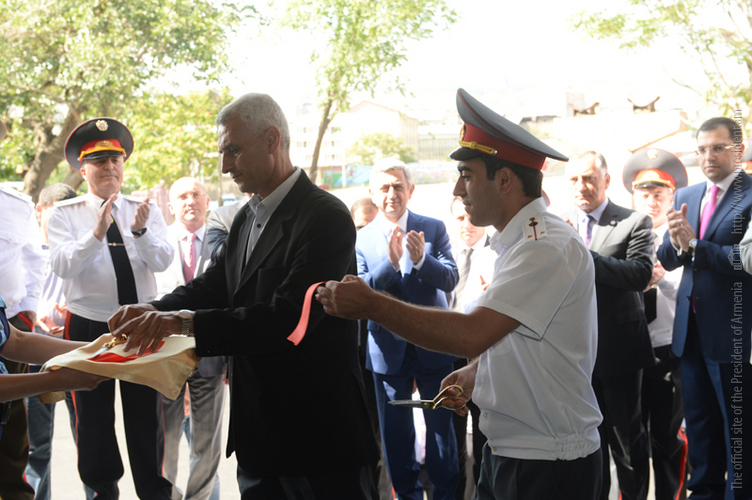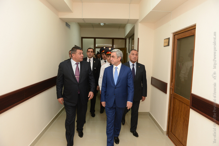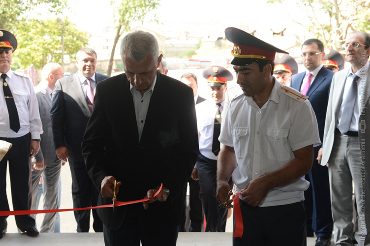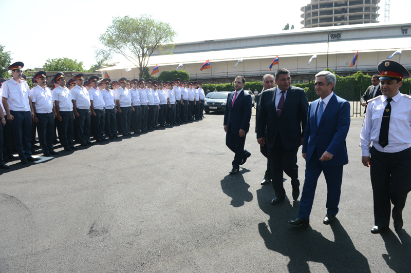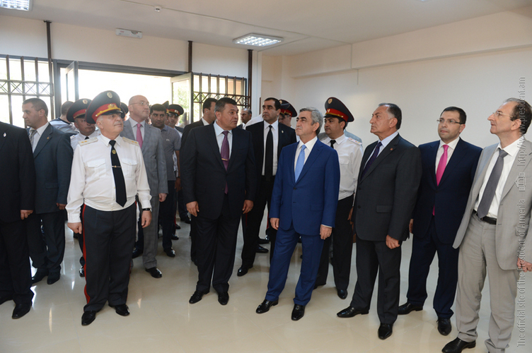President Serzh Sargsyan attended today the ceremony of inauguration of the new Central Branch administrative building of the Yerevan Department of the Armenian Police Force. The President of Armenia toured the premise of the newly opened Police Department, familiarized with the accomplished works and conditions created for the staff. The Department is equipped with the necessary office furniture and devises, a modern system of communication, a duty station fully set for operational activities, a hall for meetings and consultations and other facilities. It was noted that functioning of the new Central Branch administrative building of the Yerevan Police Department will allow to provide improved services to the citizens, upgrade working conditions for the police staff, supply the Force with the required material and technical devises, and ensure the performance of the police duties in line with contemporary methods. According to the leadership of the Police, the operation of the new Central Branch administrative building of Yerevan Police Department is yet another step in the implementation of the reforms aimed at the modernization of the structure.