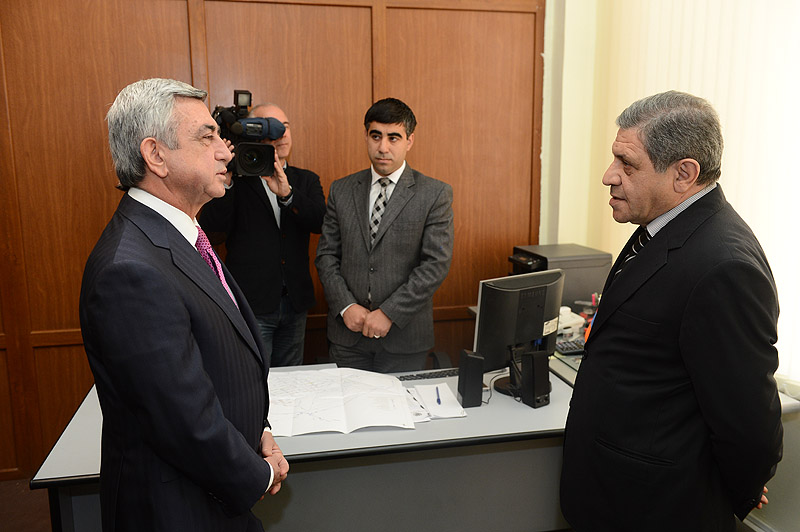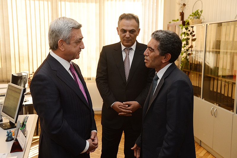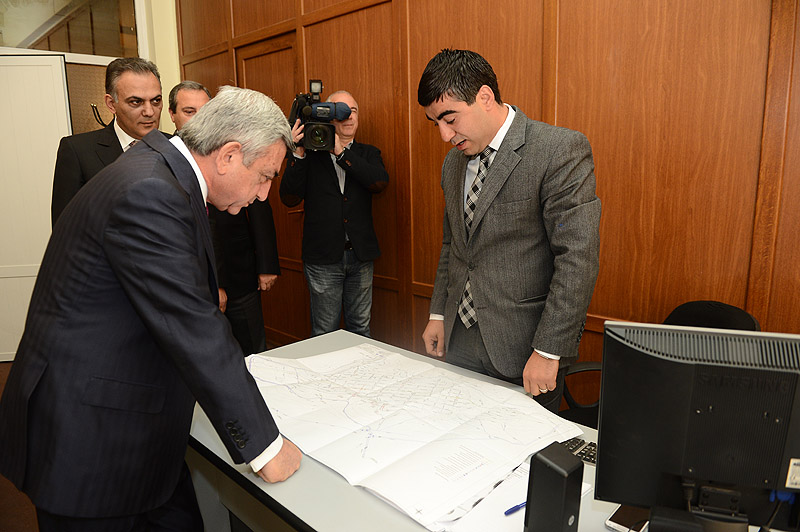 President Serzh Sargsyan visited today the RA Ministry of Transportation and Communications. The President toured the Ministry, familiarized with the working conditions of the staff and conversed with the employees about their work, existing problems, and prospects of development. Later, Serzh Sargsyan held a meeting with the participation of the leadership of the Ministry. At the meeting, Minister Gagik Beglarian presented a report on the results of the activities carried out in 2012 and first nine months of year 2013. First Deputy Minister Hrant Beglarian reported on the activities of the railroad in the same period of time, while Deputy Ministers Artashes Avetissian and Andranik Alexanian presented correspondingly concise briefings on the works conducted by the Ministry in the area of motor traffic and in the area of communication and telecommunication. The Chief of Staff of the Ministry Gagik Grigorian presented main figures related to the work of the Staff. The participants of the meeting were briefed also on the problems and developments related to the North-South Highway investment program for 2012 and nine months of 2013. The briefing was made by the Director of the North-South Highway non-profit organization Arthur Sarkissian.