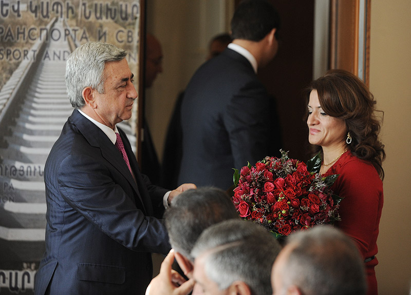 Serzh Sargsyan concluded his meeting with the leadership of the Ministry of Transportation and Communications by awarding a group of employees. The Head of the Economic, Financial and Accounting Department Vanya Atiyan, Leading Specialist of the Shipping Desk of the Transportation Department Ruzanna Ayvazian, Deputy Head of the Mail Department Tsovinar Galstian, Director General of the Republican Center of Communications non-profit organization Ashot Verdian for their years-long and diligent work received Letters of Commendation from the President.