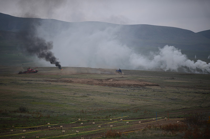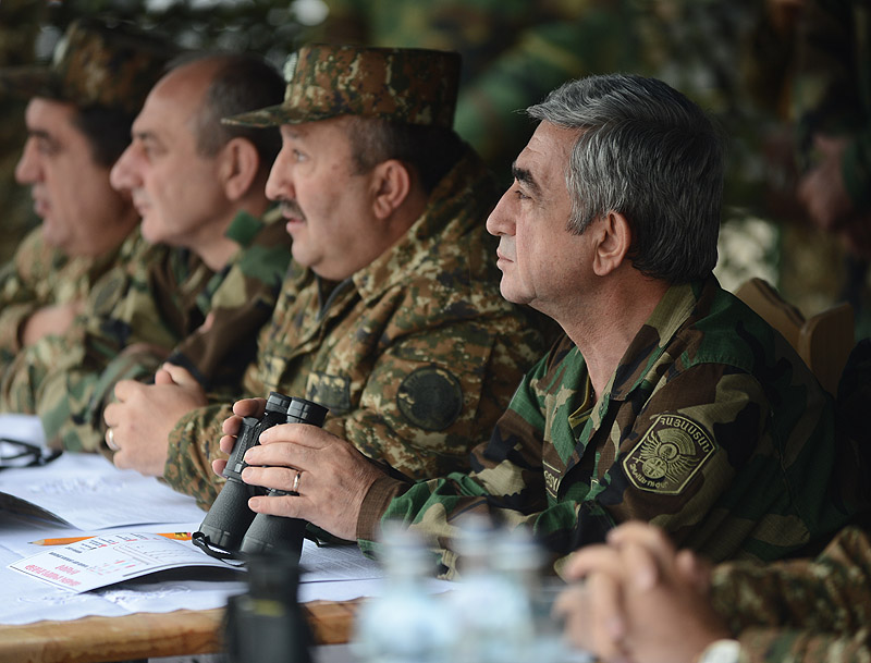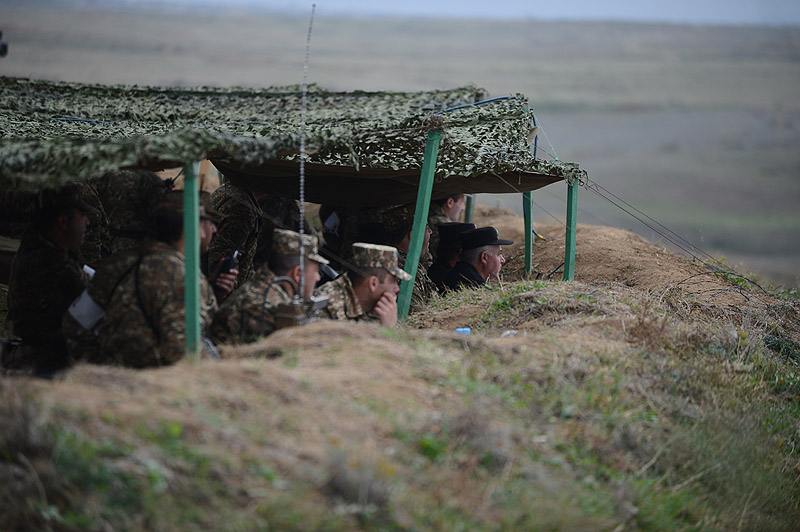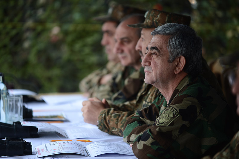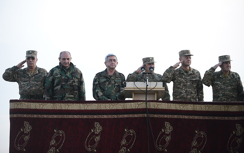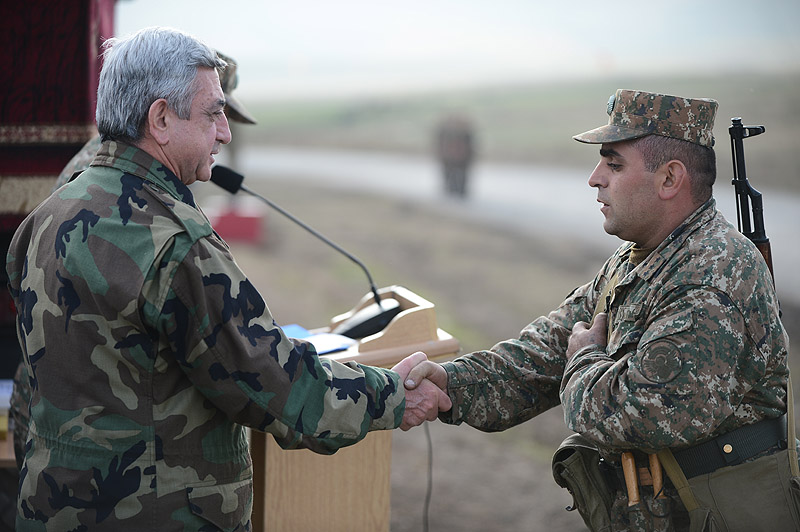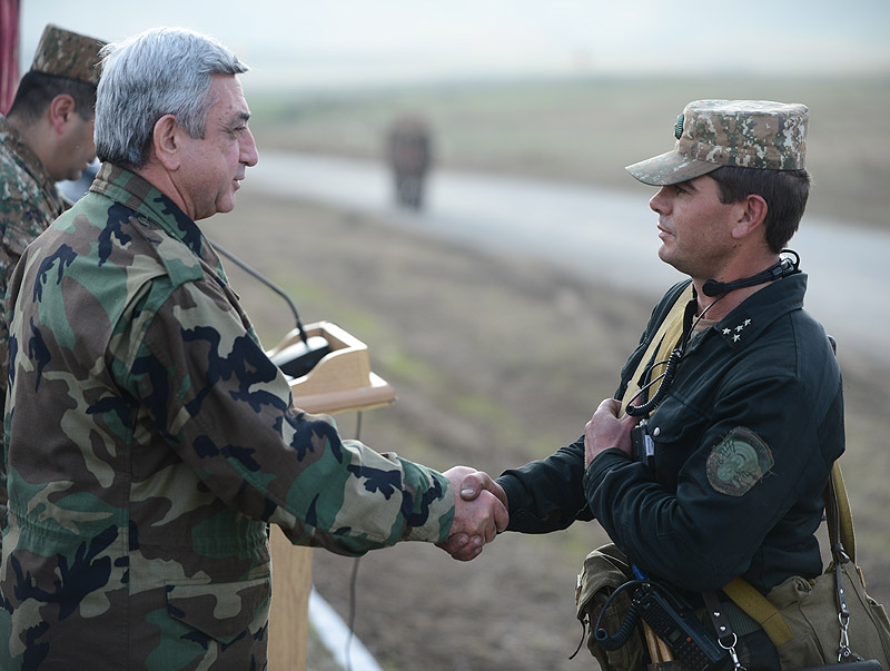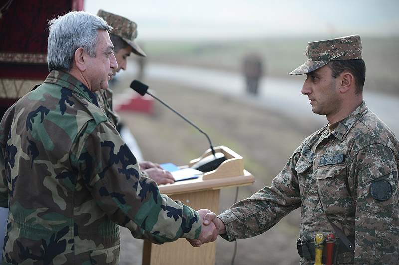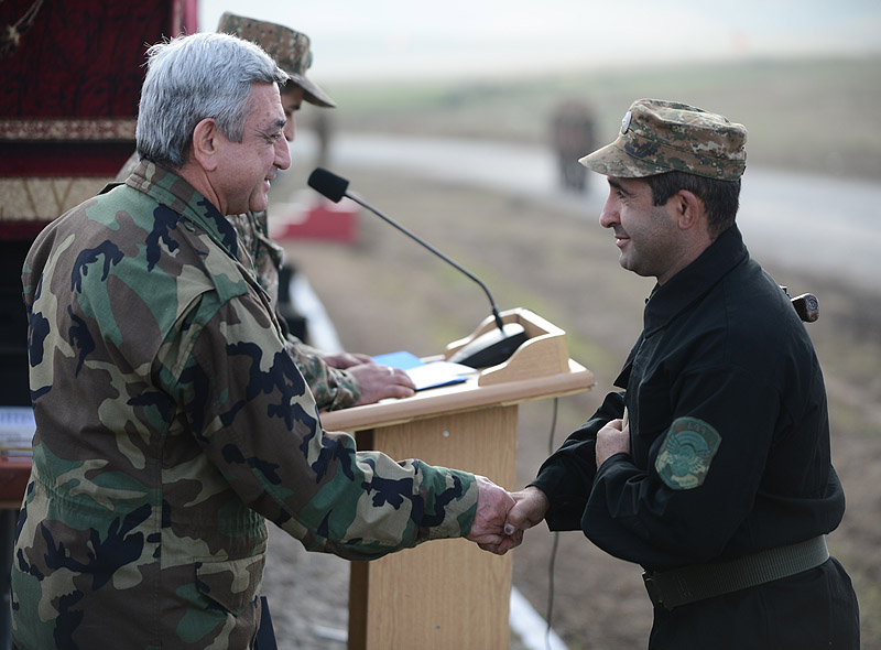 On the second day of his working visit to the Republic of Nagorno Karabakh, President Serzh Sargsyan together with President of NKR Bako Sahakian observed a “tank combination” competition conducted at the Tigranakert training ground. The competition revealed the best participant through the precise firing and other requirements. Later, at the same training ground the Presidents of the two Armenian Republics observed the two-sided tactical exercise titled “Preparing the assault force of the Defense Army for full combat readiness: organization of defense, conduct of defensive battle, organization of assault.” The most important elements of the exercise were the actions of the raiding detachment in the flanks and in the rear of the enemy. Military exercised were followed by the ceremony of awarding the personnel: the most active participants of the exercised received emoluments.