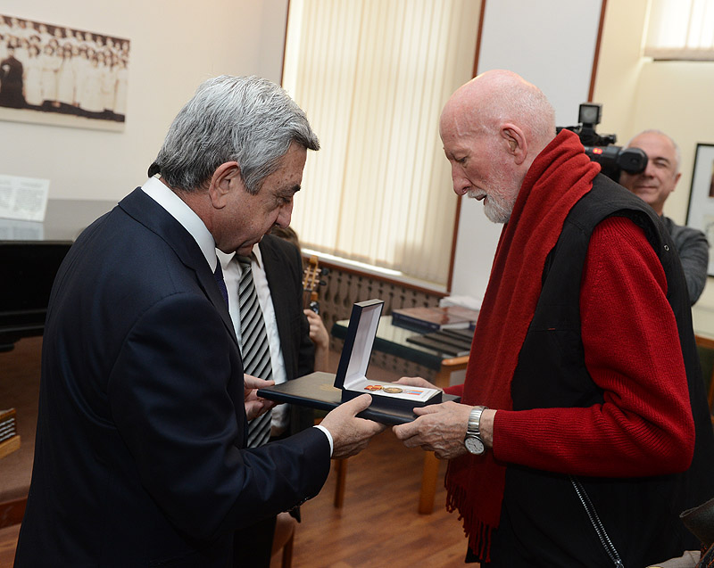 After observing the exhibition, the President of Armenia at the Komitas Hall of the Museum awarded Volkmar Gantzhorn (Germany) with the Movses Khorenatsi Medal for his remarkable work in presenting to the world the Armenian carpet weaving craft and promotion of the international recognition of the Armenian carpets. Volkmar Gantzhorn has arrived to Armenia to participate at the presentation of the Armenian translation of his book “The Christian Oriental Carpet: a presentation of its development, iconologically and iconographically, from its beginnings to the 18th century” which is organized in the framework of the “Armenian Knot: Traditions of Carpet Weaving Art” international conference. The Director of Armenia’s Museum of History Anelka Grigorian presented to Serzh Sargsyan and other guests of the exhibition the author of the mentioned above book and his work. She noted that the book of 534 pages which has an encyclopedic value is unprecedented in its demonstration of over a thousand of samples and drawings. Besides being reprinted twice in German language, it has been printed in thousands copies in English, French, and Italian. The inauguration of the Armenian translation is a cultural event; the book is a unique manual of the carpet weaving art, a single invitation to the contemporary and future scientists to bring forward and explain various issues existing in the Armenian history and culture. Anelka Grigorian also quoted the author, Doctor Volkmar Gantzhorn, “The ornamental treasury of the oriental carpets is part of the Armenian identity and should be treated as such.” The German scientist expressed gratitude for such a high award and spoke about the motives behind this significant undertaking.