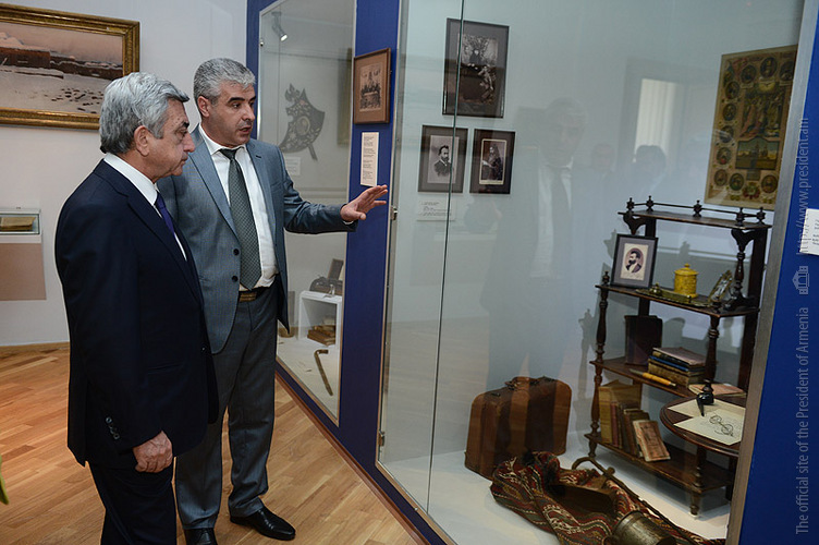 President Serzh Sargsyan visited today the E. Charents Museum of Literature and Arts where he observed the new exhibition of the Museum. According to the Director of the Museum Karo Vardanian, the exhibition encompasses the Armenian literature, dramatic and cinema art, and music of the 18-20 centuries. The exhibited pieces are relating not only about the hundreds of devotees of the Armenian literature and arts but also about educational, scientific and cultural, literary, musical establishments and theater groups, unions and editorial staffs of prominent periodicals which had their imprint on the Armenian reality.