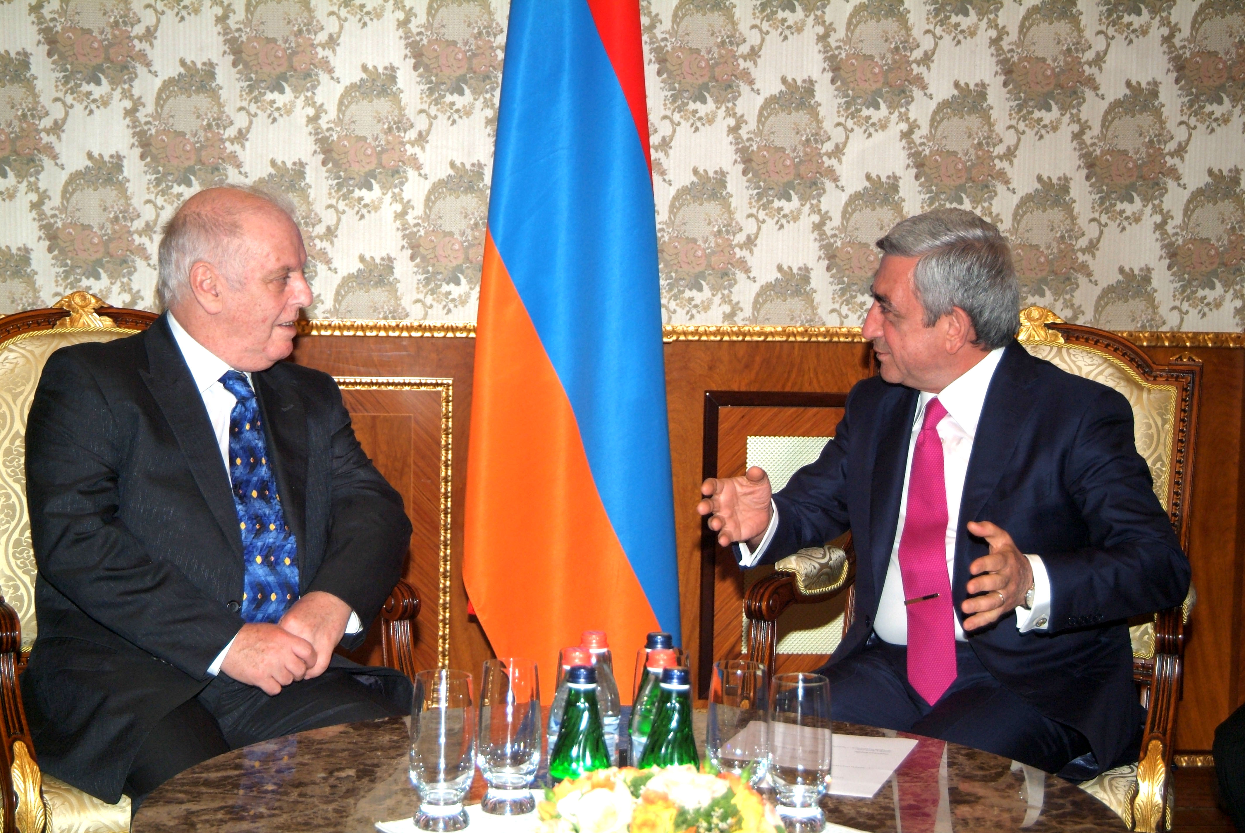 The President of Armenia welcomed the celebrated guest to our country. Serzh Sargsyan highly appreciated the initiative of Yerevan Perspectives Festival which, in spite of having limited opportunities, has done its best for years to introduce the greatest masters of world music to Armenian spectators. According to the president, it also gives famous people a good opportunity to visit Armenia, to join the age-old history and culture of Armenian people and to become friends with them. The president also welcomed and highly appreciated the fact that the well-known Israeli musician Daniel Barenboim – the citizen of Argentina and Israel and the honorary citizen of Palestine and Spain – is engaged in other activities which are the fight for peace and justice in the world.