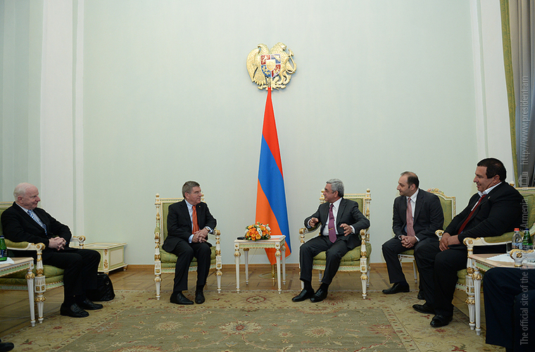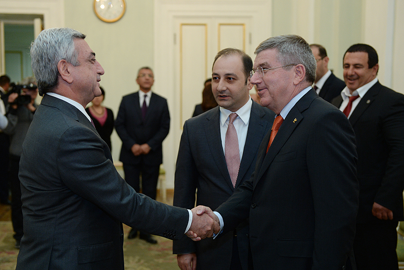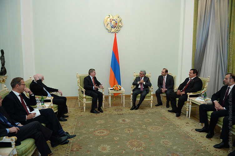 President Serzh Sargsyan today received a delegation headed by the President of the International Olympic Committee (IOC) Thomas Bach who has arrived in the Republic of Armenia on a working visit. The delegation included the President of the European Olympic Committee (EOC) Patrick Hickey and a number of IOC officials.