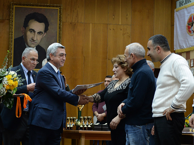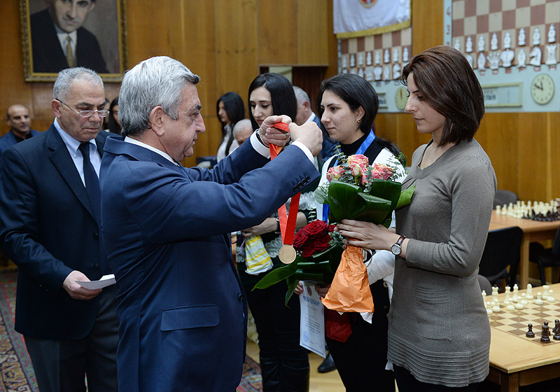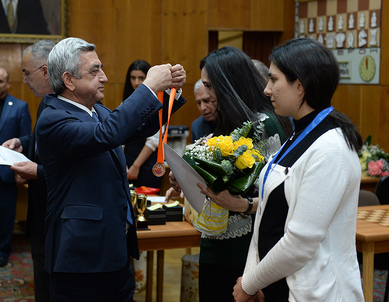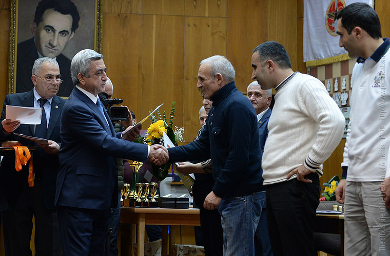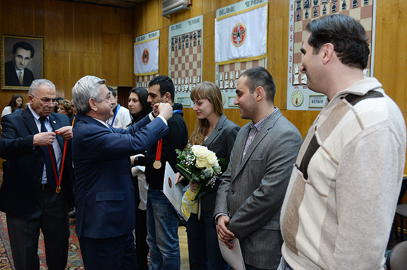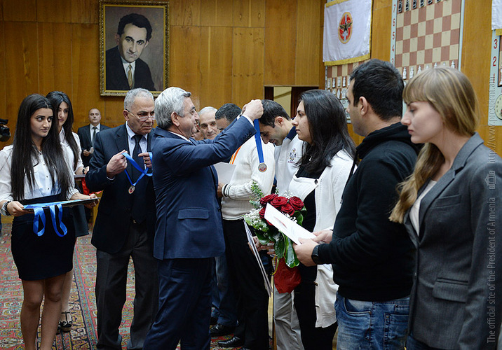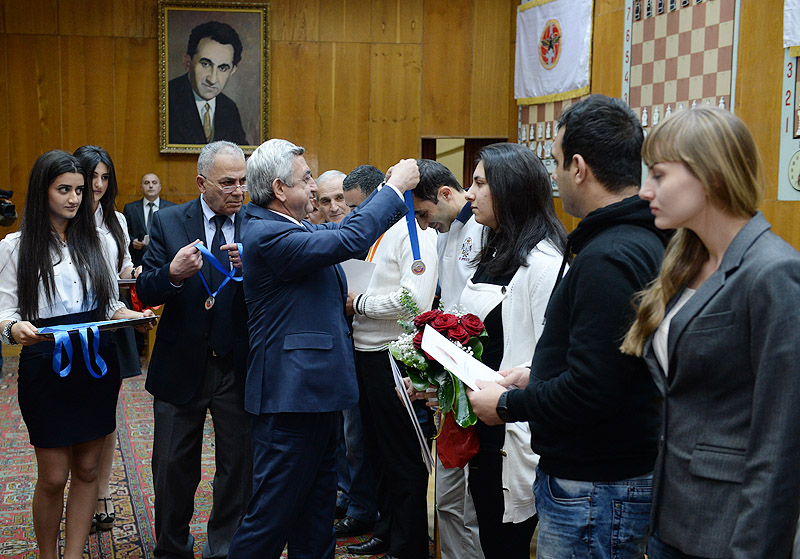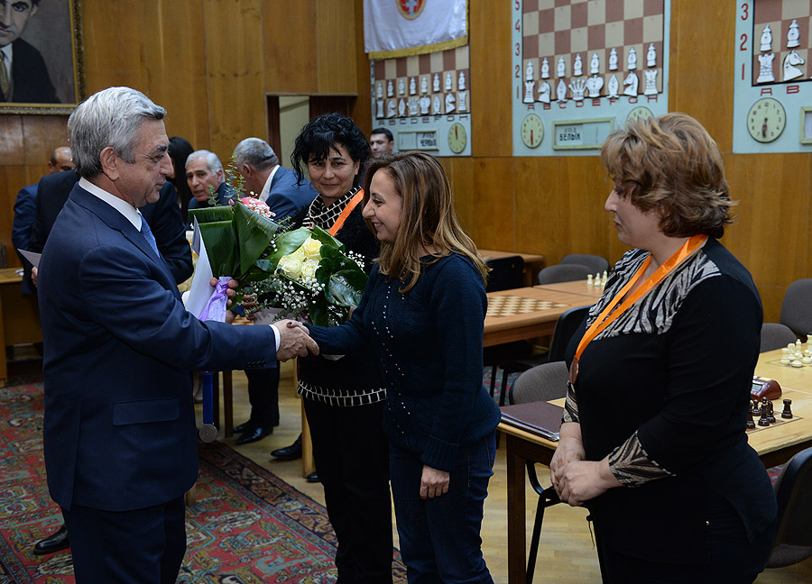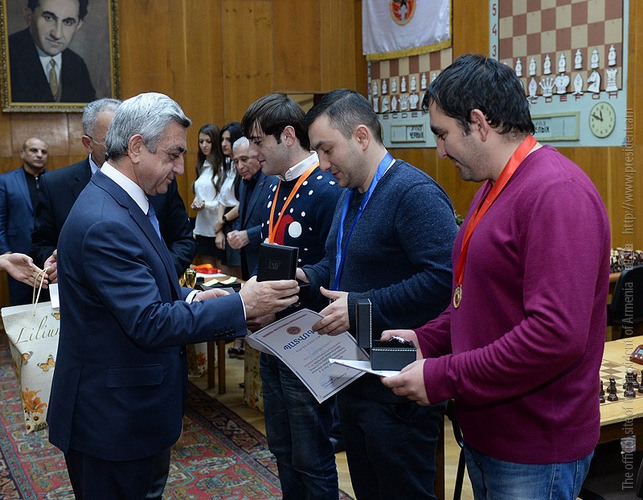 The RA President and the President of the Armenian Chess Federation, Serzh Sargsyan, today participated in the closing ceremony of a fast chess tournament at Tigran Petrosian Chess House, based on the 12th RPA traditional game schedule. The teams representing the RPA territorial organizations took part in the tournament. Serzh Sargsyan handed cups, diplomas and medals to the prize winners of the individual and team tournament.