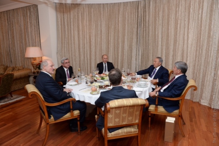 This evening, at the Ararat Park Hyatt Hotel – the RA President’s residence in Moscow – President Serzh Sargsyan hosted a reception to mark the completion of the process of Armenia’s accession to the Eurasian Economic Union Treaty. Later on, President Serzh Sargsyan had an intimate dinner with Belarusian President Alexander Lukashenko, Kazakhstani President Nursultan Nazarbayev, Kyrgyzstani President Almazbek Atambayev, Russian President Vladimir Putin and Russian Prime Minister Dmitry Medvedev at his residence.