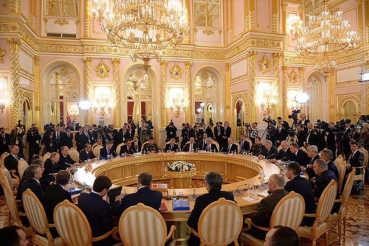 Following the meeting between the Russian, Belarusian, Kazakhstani, Armenian, Kyrgyzstani, Tajikistani Presidents and the organization’s Secretary-General, the negotiations were opened up to allow the participation of the official delegations.