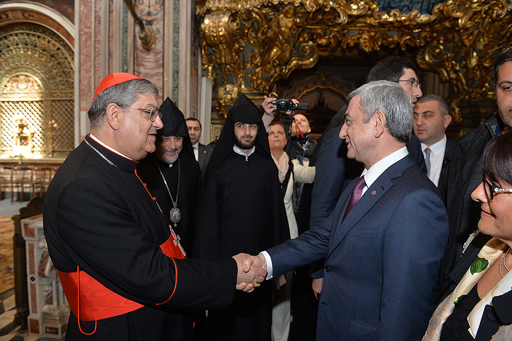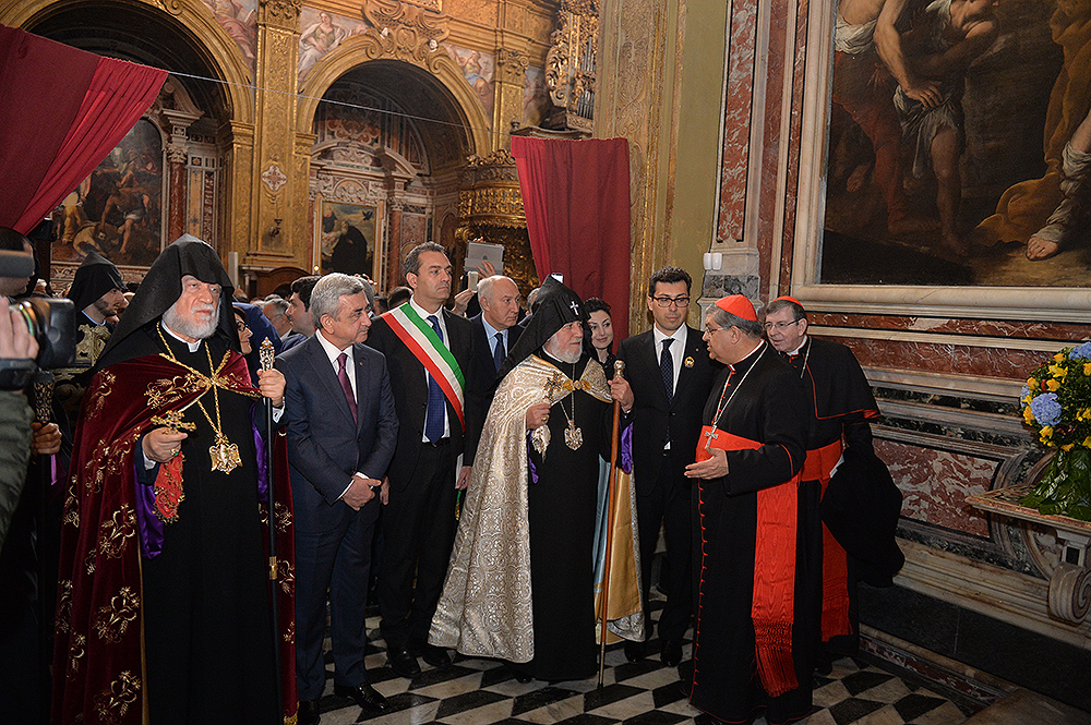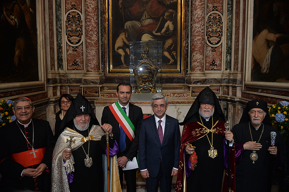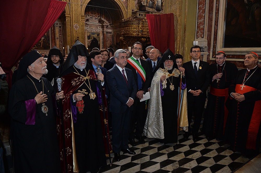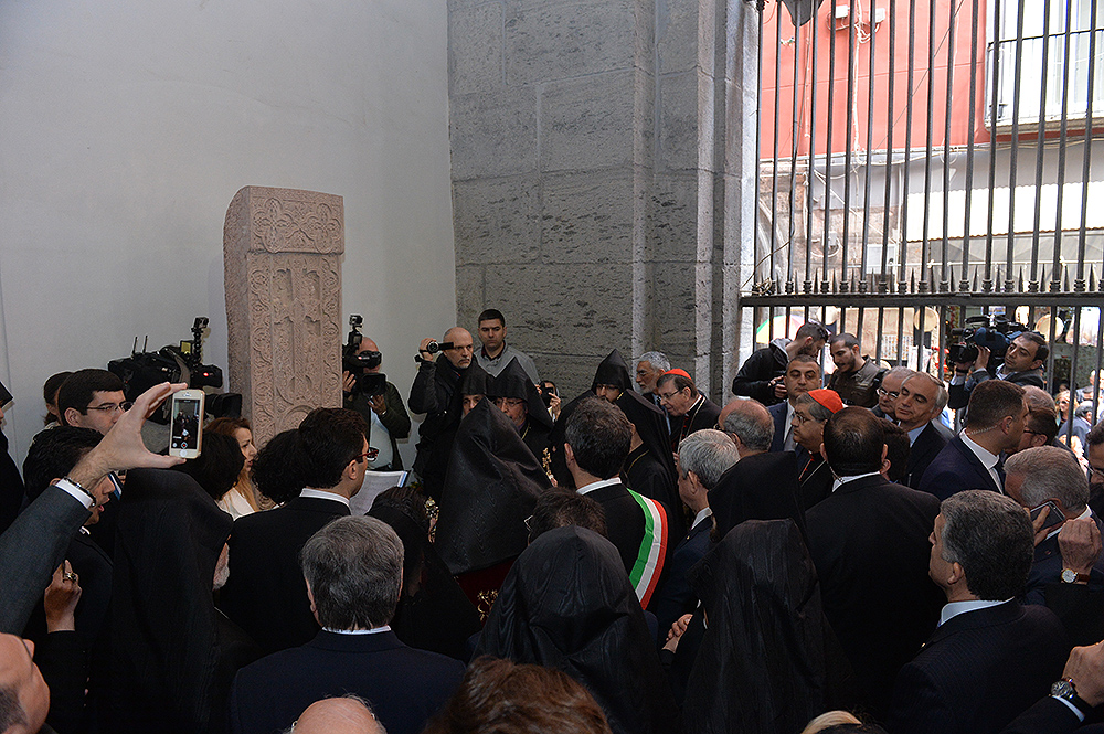 President Serzh Sargsyan, who has paid an official visit to the Italian Republic, today attended an ecclesiastical ceremony at Saint Gregory the Illuminator Church in Naples, performed by His Holiness Karekin II, Supreme Patriarch and Catholicos of All Armenians, and Cardinal Sepe and an opening and consecration ceremony of a memorial to the Armenian Genocide – a duplicate of one of Jugha cross-stones. The Armenian President delivered a speech on the occasion of the cross-stone opening ceremony and the return of Saint Gregory the Illuminator’s relics.