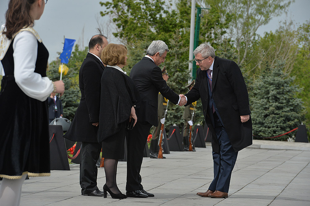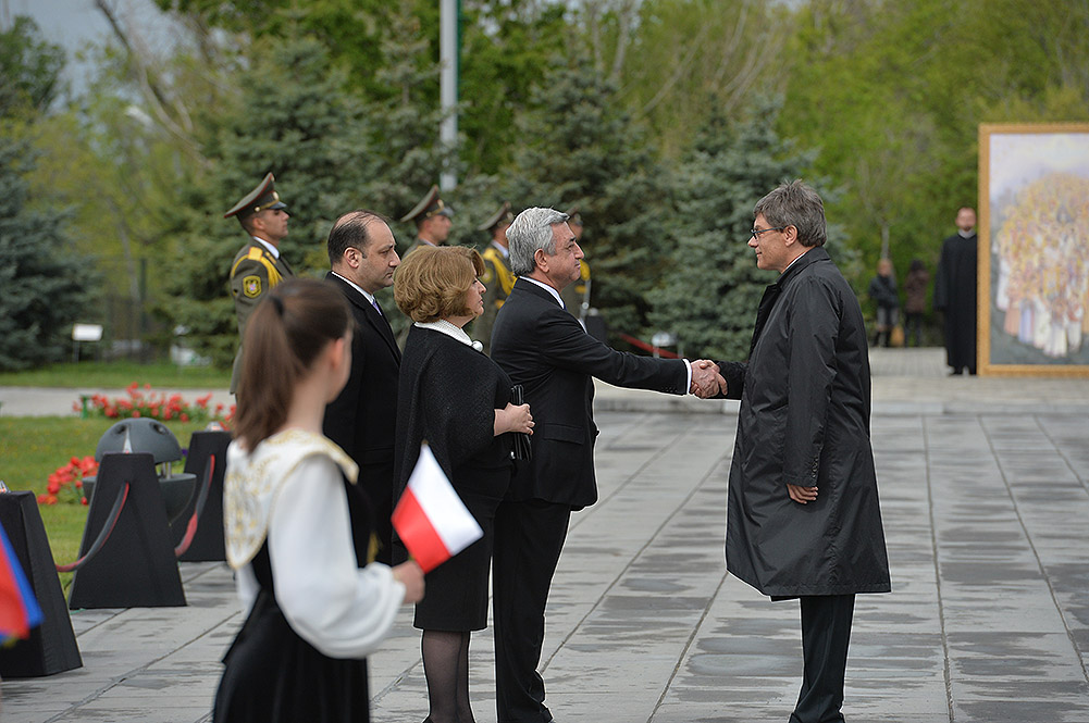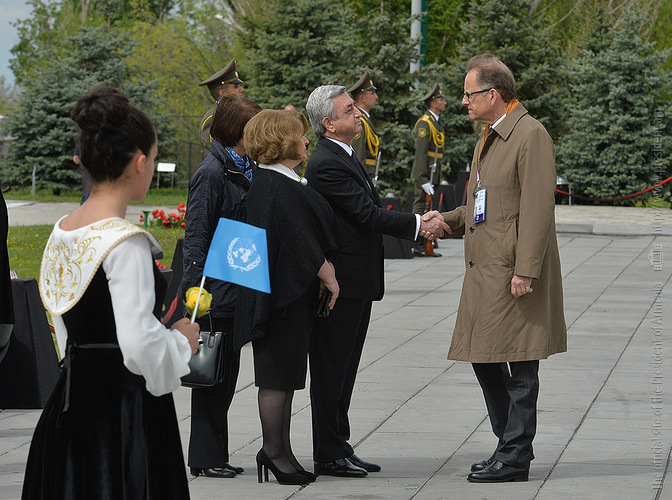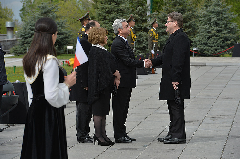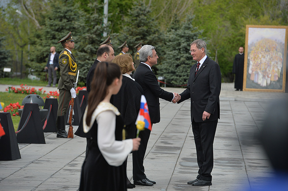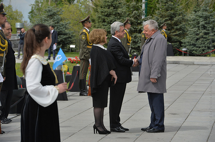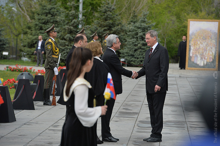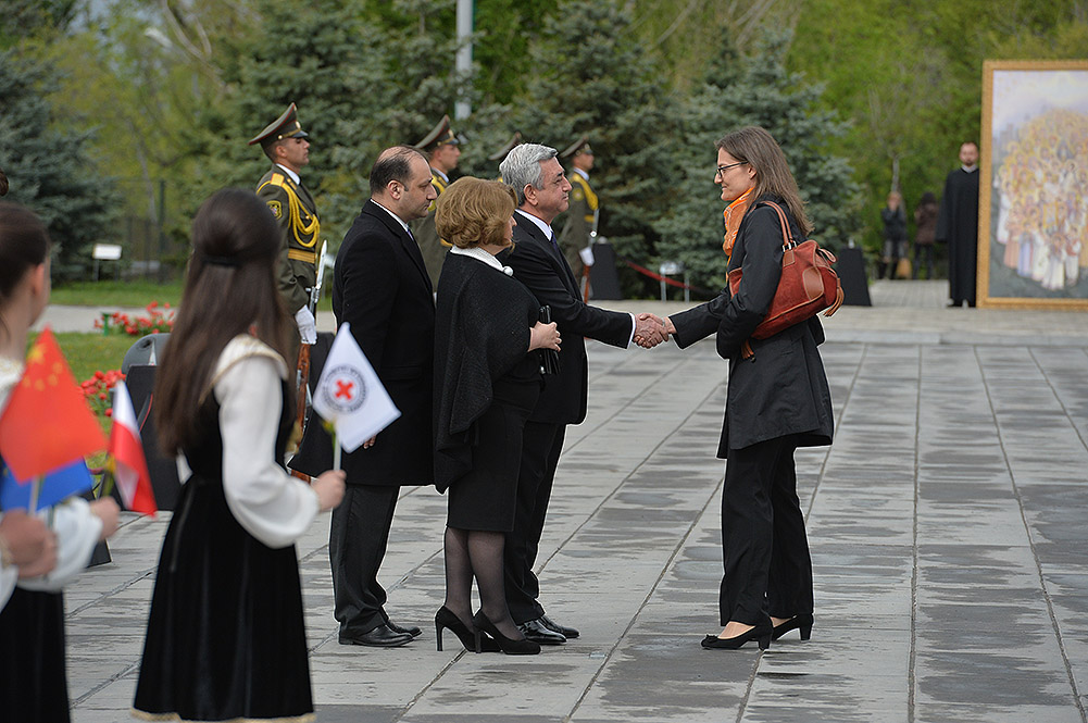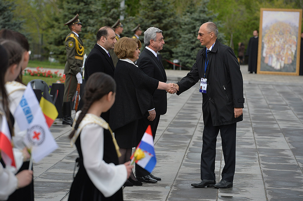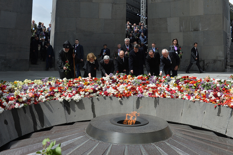 We stand on Tsitsernakaberd Hill today to commemorate the victims of the Armenian Genocide. On the 24th of April, this day a hundred years ago, the extensive enactment of one of the gravest crimes of the 20th century began with mass arrests of the Armenian intellectuals in Constantinople, the capital of the Ottoman Empire, and other cities of the empire. It had been preceded by the disarmament and massacre of the Armenian servicemen. What subsequently happened in 1915 and the years that followed was unprecedented in terms of volume and ramifications.