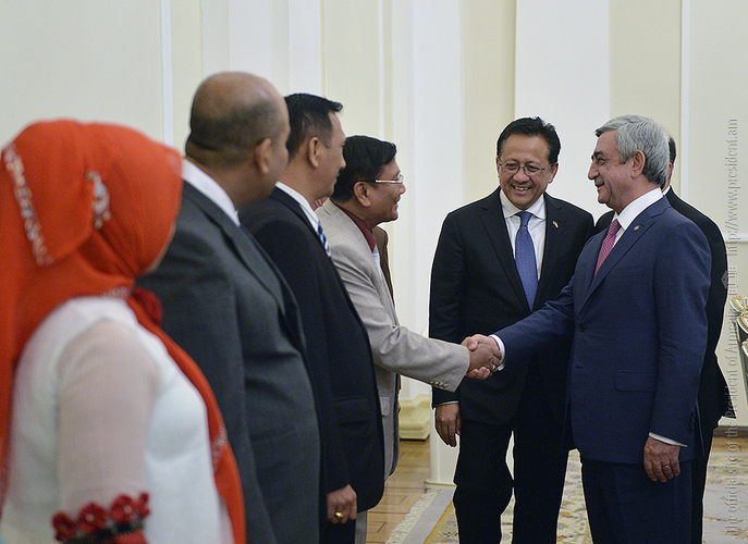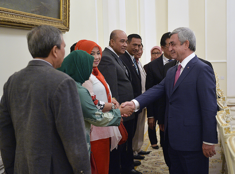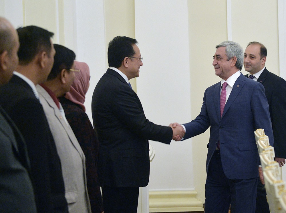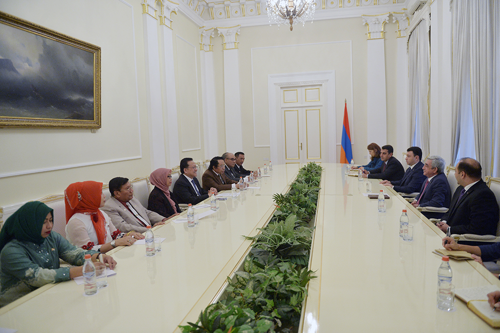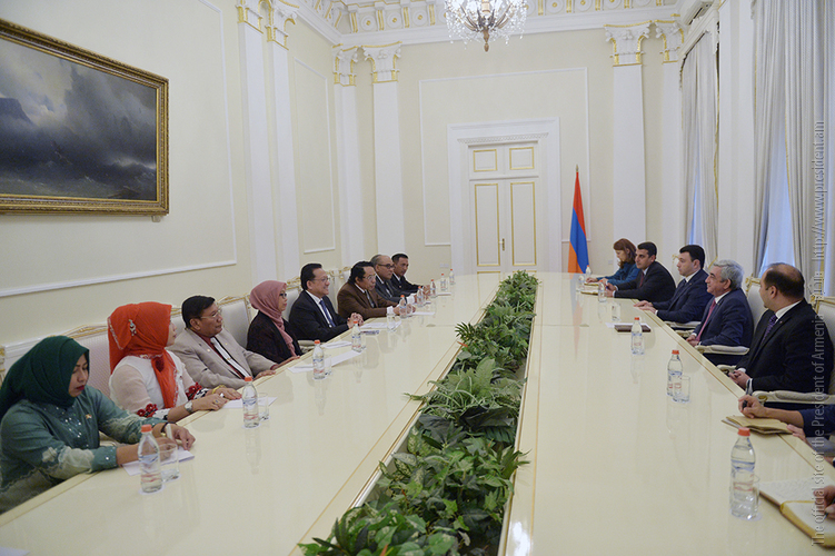 President Serzh Sargsyan received today the delegation headed by Irman Gusman, speaker of the Regional Representative Council (Senate) of the Republic of Indonesia. The president welcomed the dignitary and his delegation, stressing that Armenia is always glad to host representatives of friendly countries.