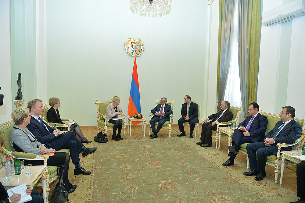 The President of Armenia and Minister of Foreign Affairs of Sweden discussed issues pertinent to the development of the Armenian-Swedish relation in bilateral as well as multilateral formats, possibilities of Sweden’s assistance to the reforms conducted in Armenia. They also exchanged views on the regional developments and challenges, current international issues, and the NK peace process. Serzh Sargsyan presented in detail approaches of the Armenian side regarding the process which is based on the basic principles and norm of international law.