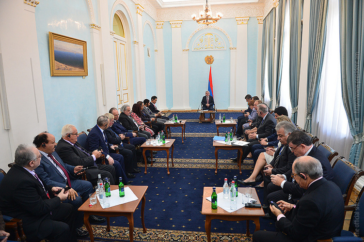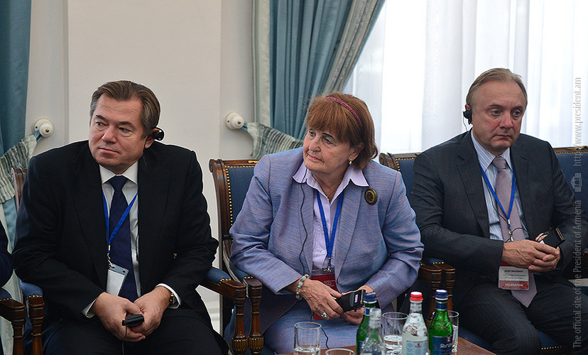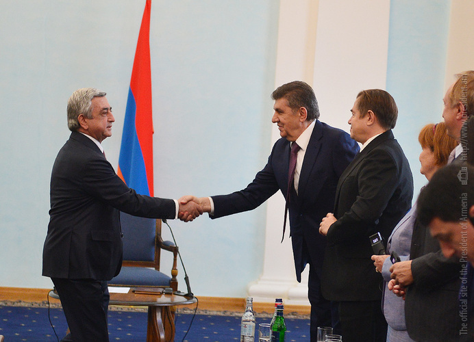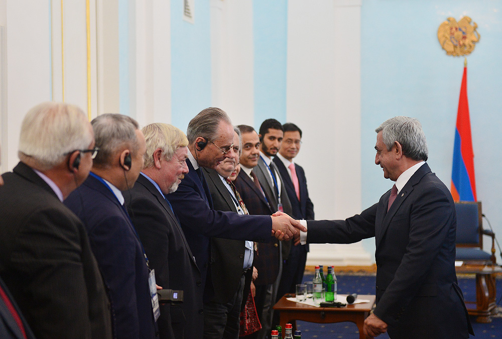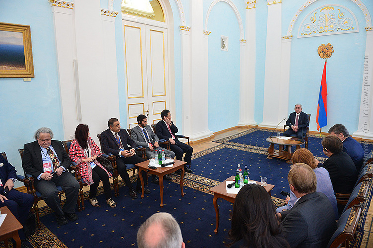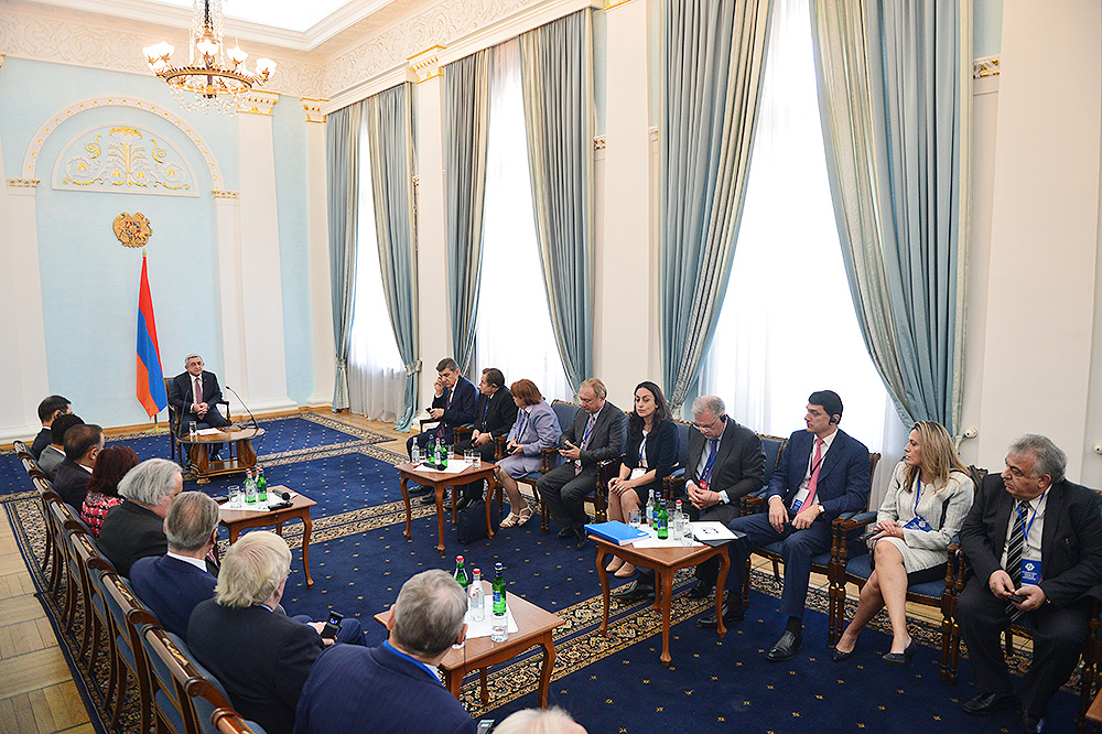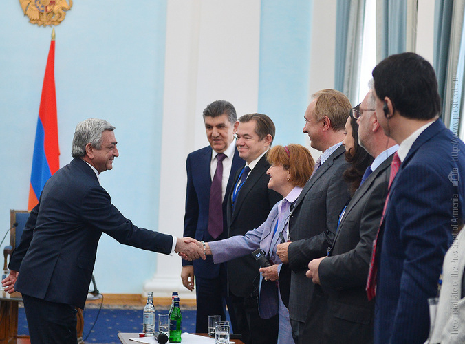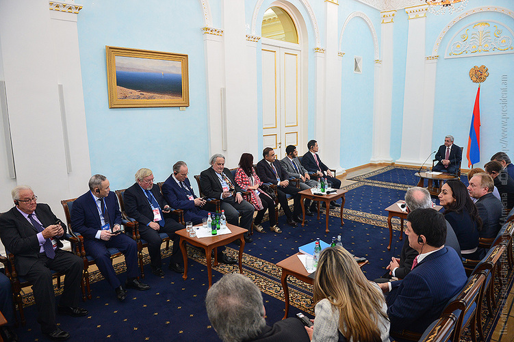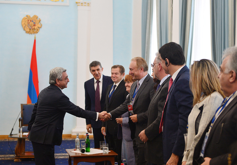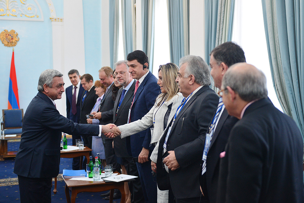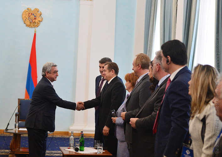 President Serzh Sargsyan received today participants of the Eurasian Partnership First International Conference. Welcoming them to Armenia, the President stressed the importance of the fact that the start of this helpful initiative carried out jointly by the World Armenian Congress and Union of Armenians of Russia is given at an impressive level since, according to President Sargsyan, each of the participants has the opportunity to bring his or her significant contribution to the success of the Conference and ensure its continuous nature. Serzh Sargsyan expressed hope that the Eurasian Partnership International Conference can become an important platform for the representatives of the state, business and public circles of the member states promoting the creation of practical mechanisms aimed at the opening of the potential for cooperation among these countries and opportunities for the expansion of the multilateral economic cooperation. President Sargsyan noted that we are always glad to welcome our partners to Armenia and that our country is open for the discussions on cooperation programs.