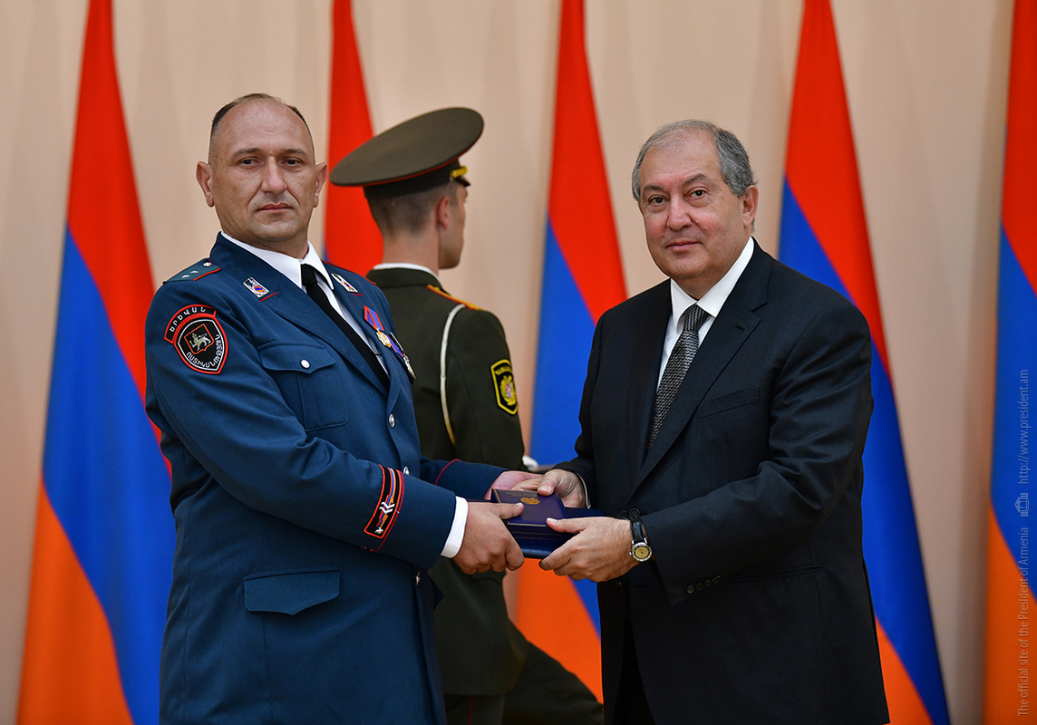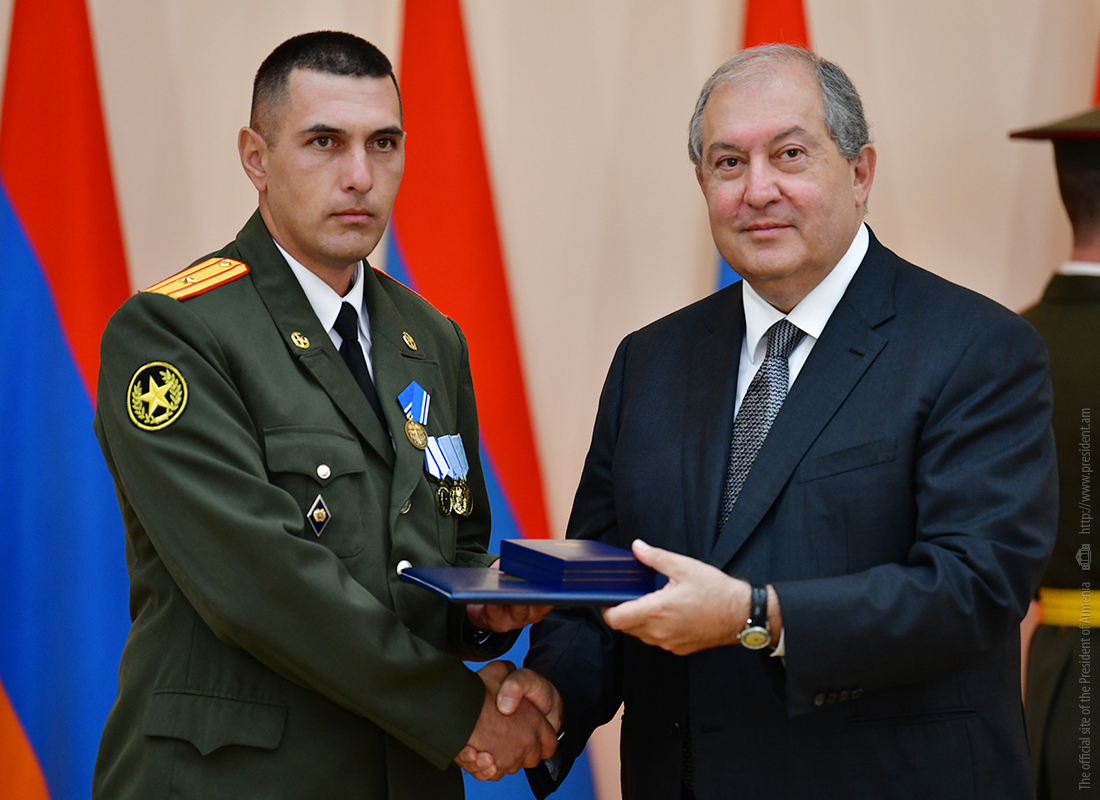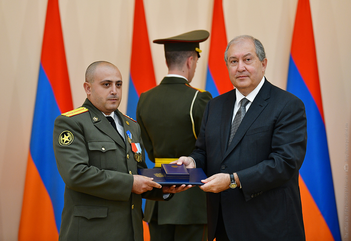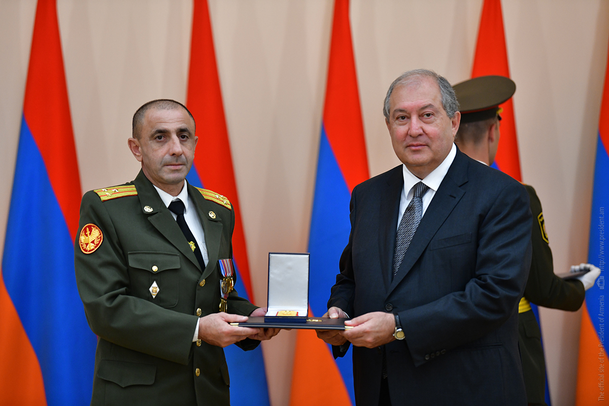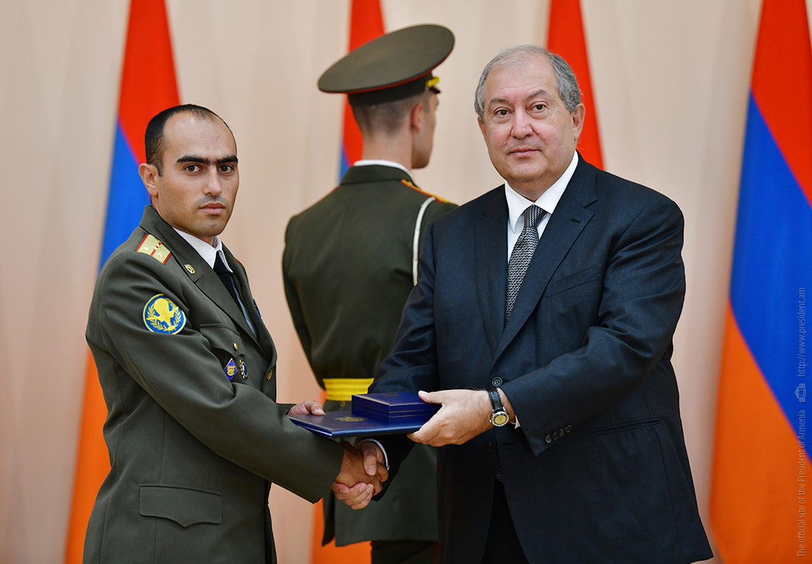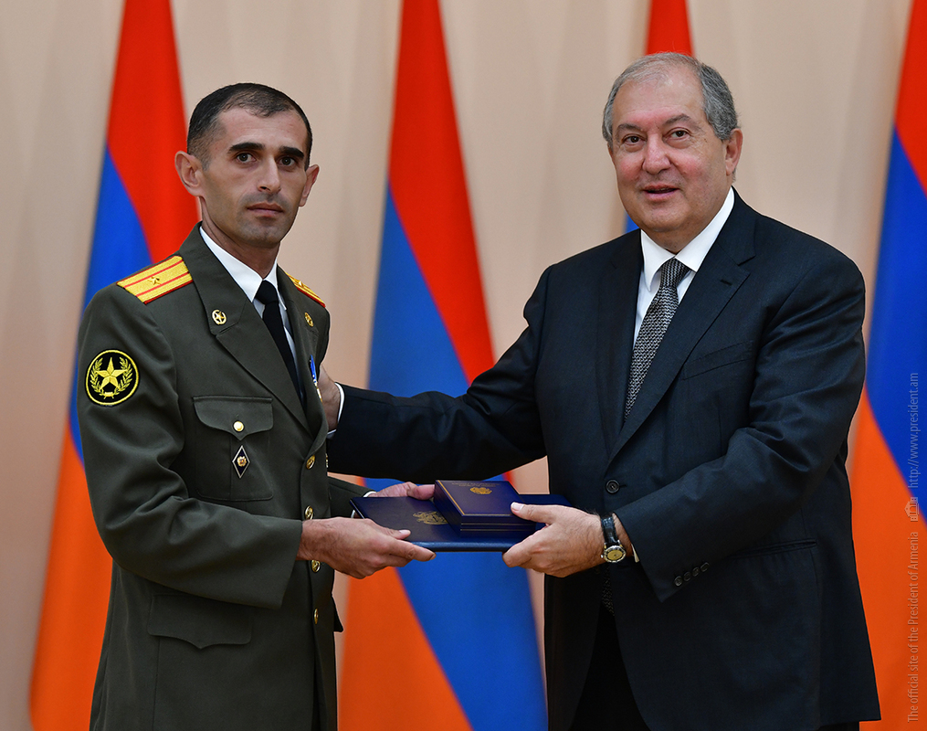On the occasion of the 27th anniversary of independence of the Republic of Armenia, by the decision of President Armen Sarkissian a group of representatives of the RA Armed Forces and RA Police for the valor and dedication as well as for the strengthening the law enforcement structure and contribution to the protection of public order were awarded the highest honors of the Republic of Armenia and military ranks.