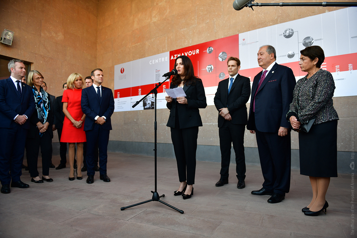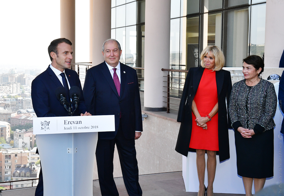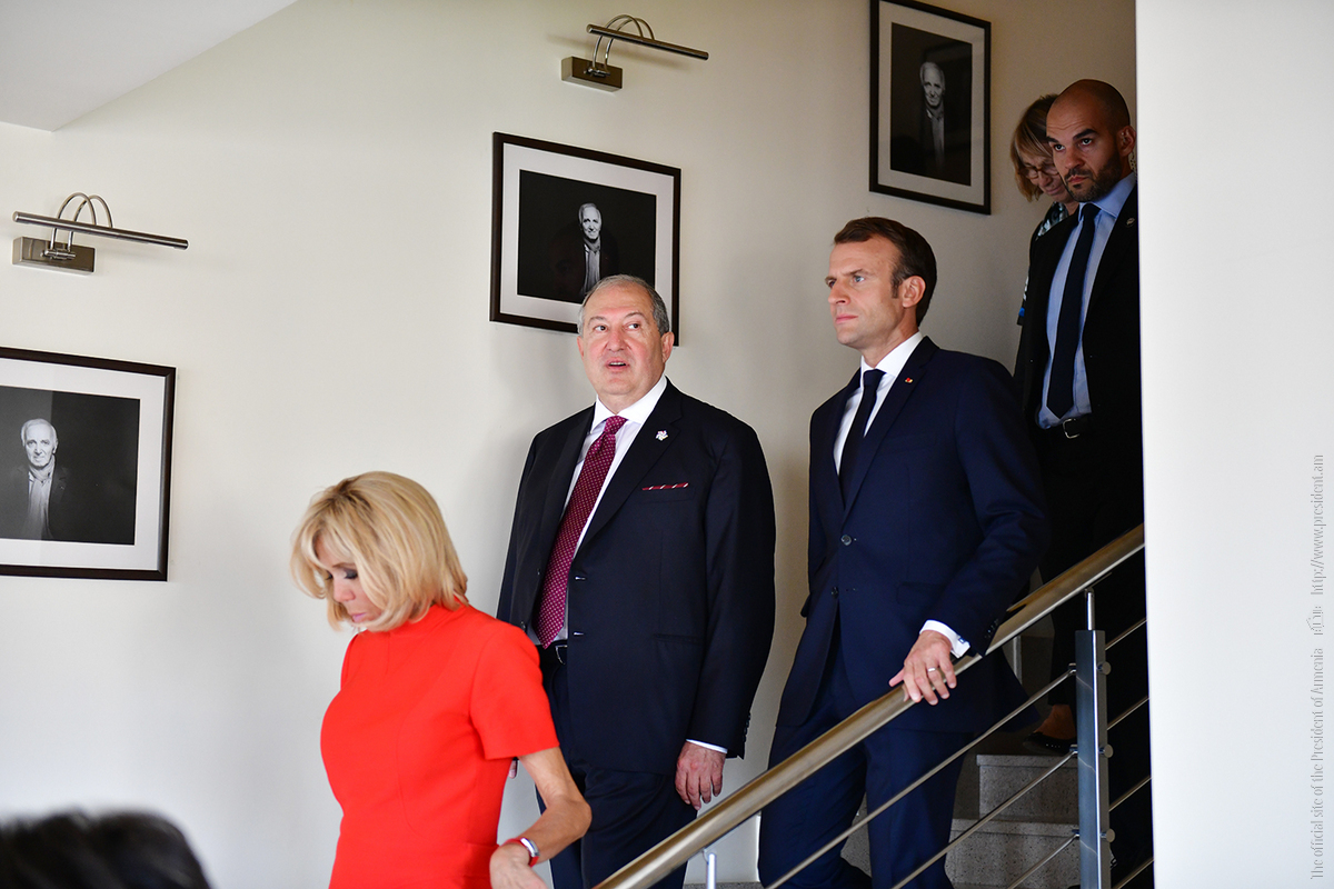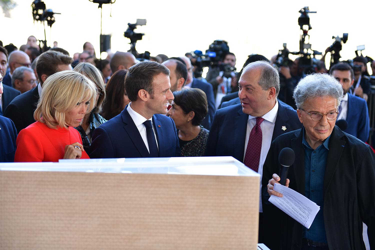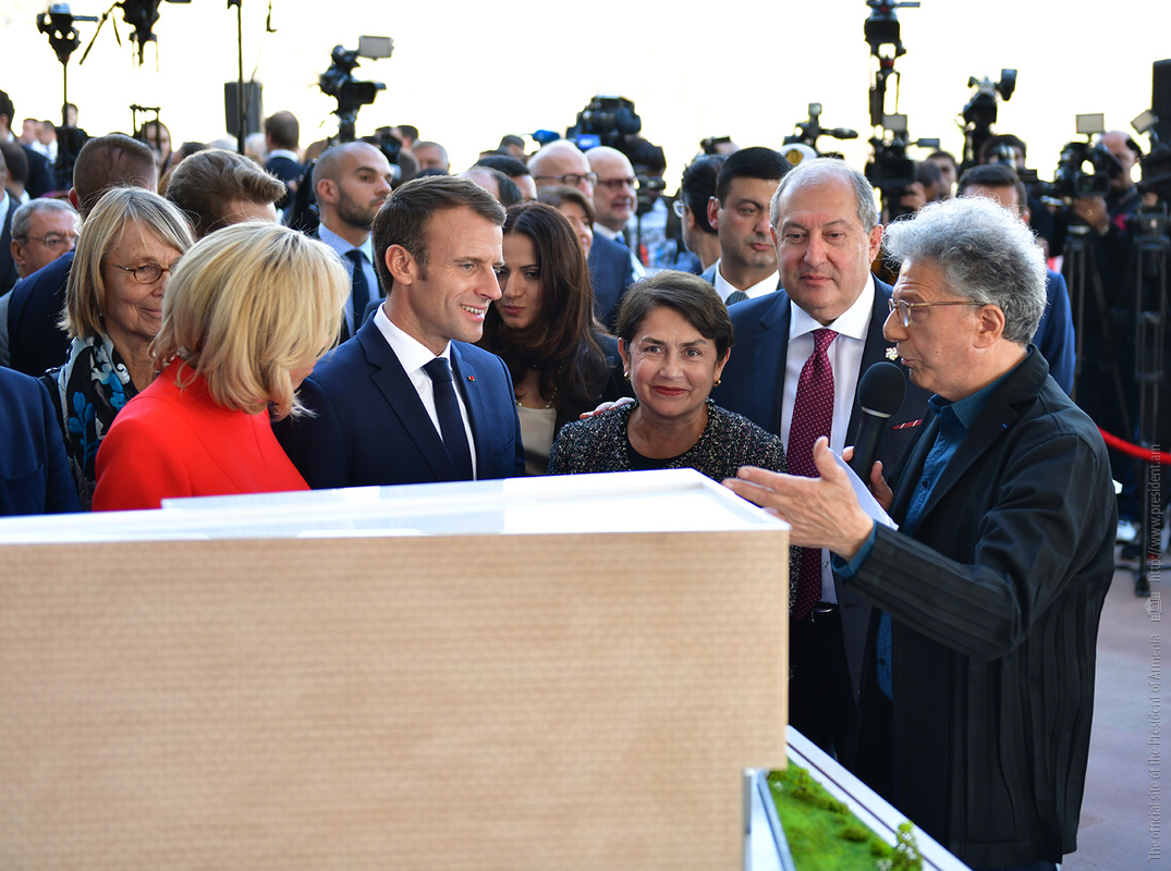 President Armen Sarkissian and Mrs. Nouneh Sarkissian together with the President of France Emmanuel Macron and Mrs. Brigitte Macron participated today at the presentation of the Aznavour Center project at the Charles Aznavour residence in Yerevan.