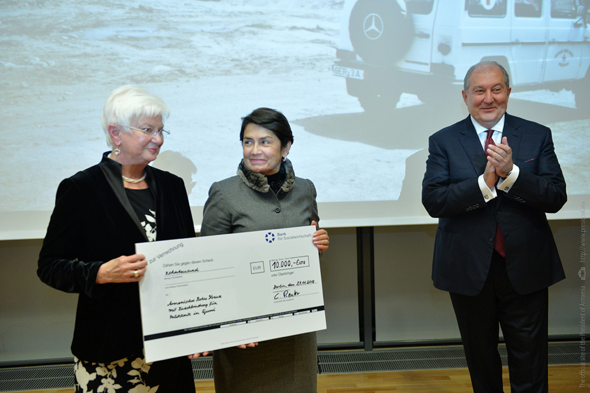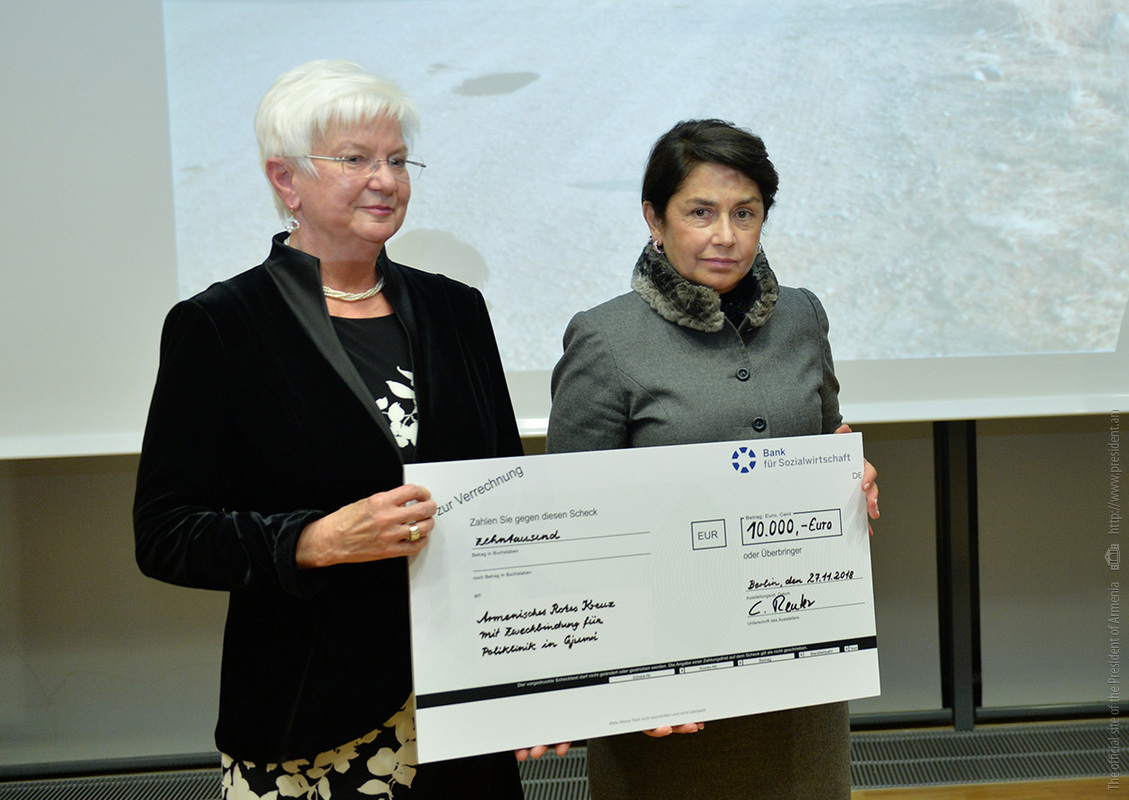 At the conclusion of the event, President of the German Red Cross Gerda Hasselfeldt handed to the spouse of the President, Mrs. Nouneh Sarkissian a certificate for 10 thousand Euros which will be used to renovate the “Berlin” outpatient clinic in Gyumri.
